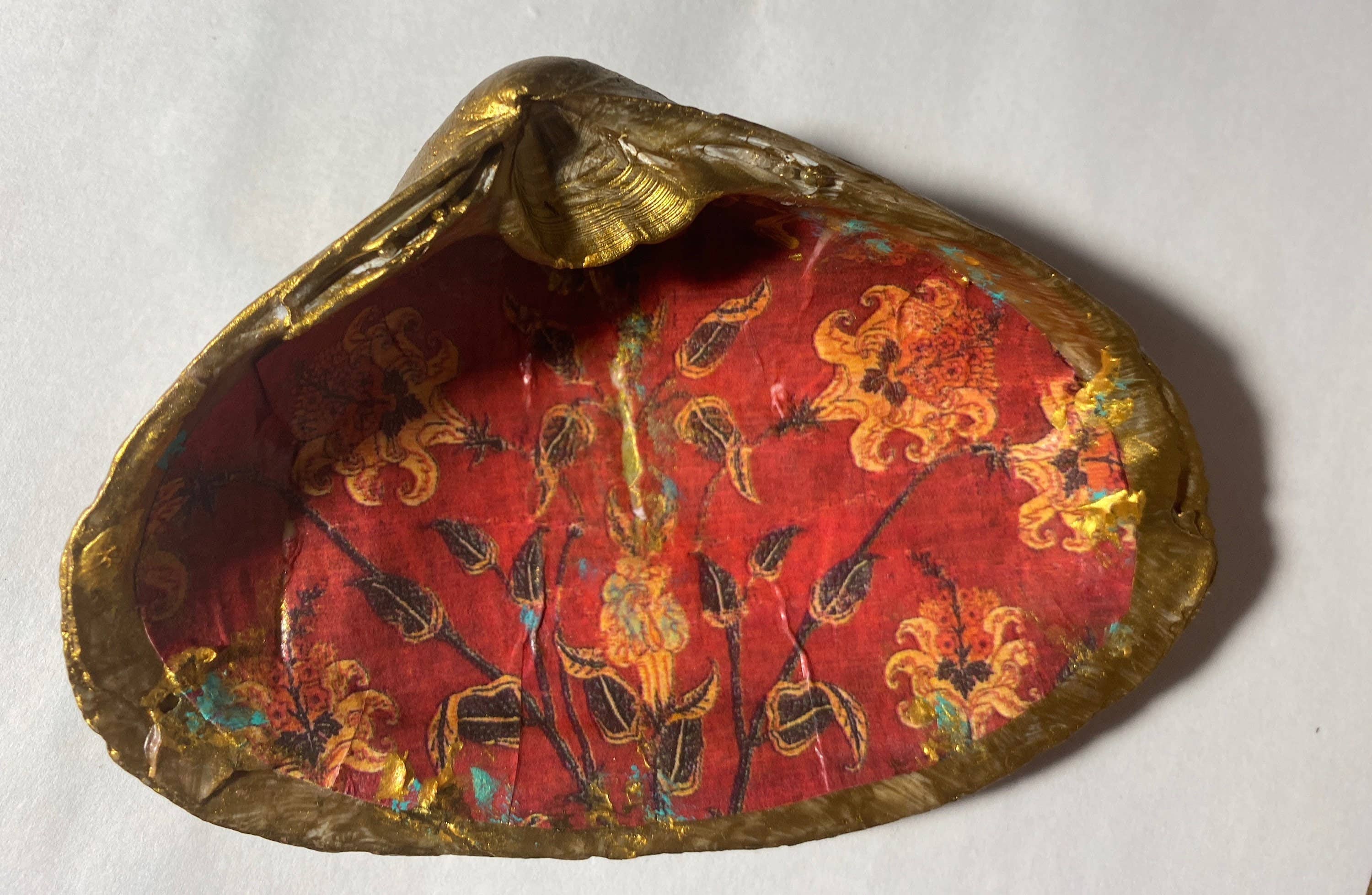 This Caladium Design Clam Shell trinket dish features a beautiful caladium leaf design, with intricate details and vibrant colors. This clam shell trinket dish is made from recycled clam shells to fit rings or small jewelry pieces. Also a great wedding gift, birthday gift, or gift for someone special! This decoupage clam shell is gilded with gold edges. Back of shell is natural. Recycled shells are one-of-a-kind creations. No two shells are alike! Each shell has its own unique shape and size. Size, shape, and design placement will vary for each individual shell. Approximate clam shell size: 4-5 in in width.