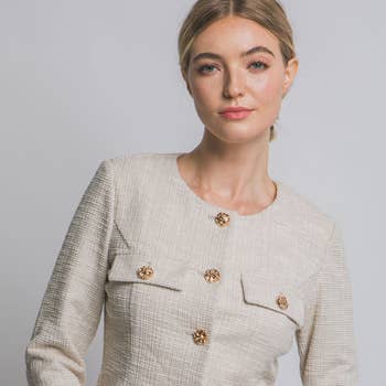 Braided Trim Tweed Button-Up Jacket -Textured tweed jacket with braided trim accents for a refined touch -Round neckline and front button closure for a timeless look -Decorative front pockets with braided trim detail -Long sleeves with a clean, structured fit -Perfect for pairing with the matching skirt or tailored trousers -Ideal for office looks, semi-formal events, or chic weekend outings -Model is 5'9.5" and is wearing a size small