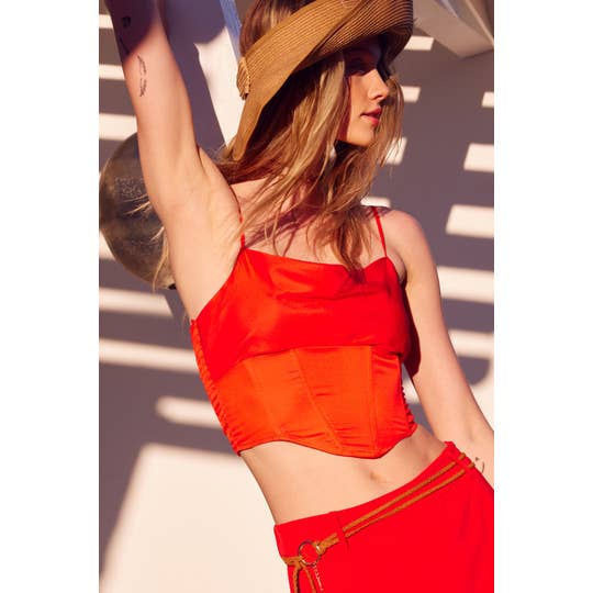 - 93% Polyester, 7% Spandex - Woven - Zipper back - Adjustable spaghetti straps - Wrap around ties - Cropped