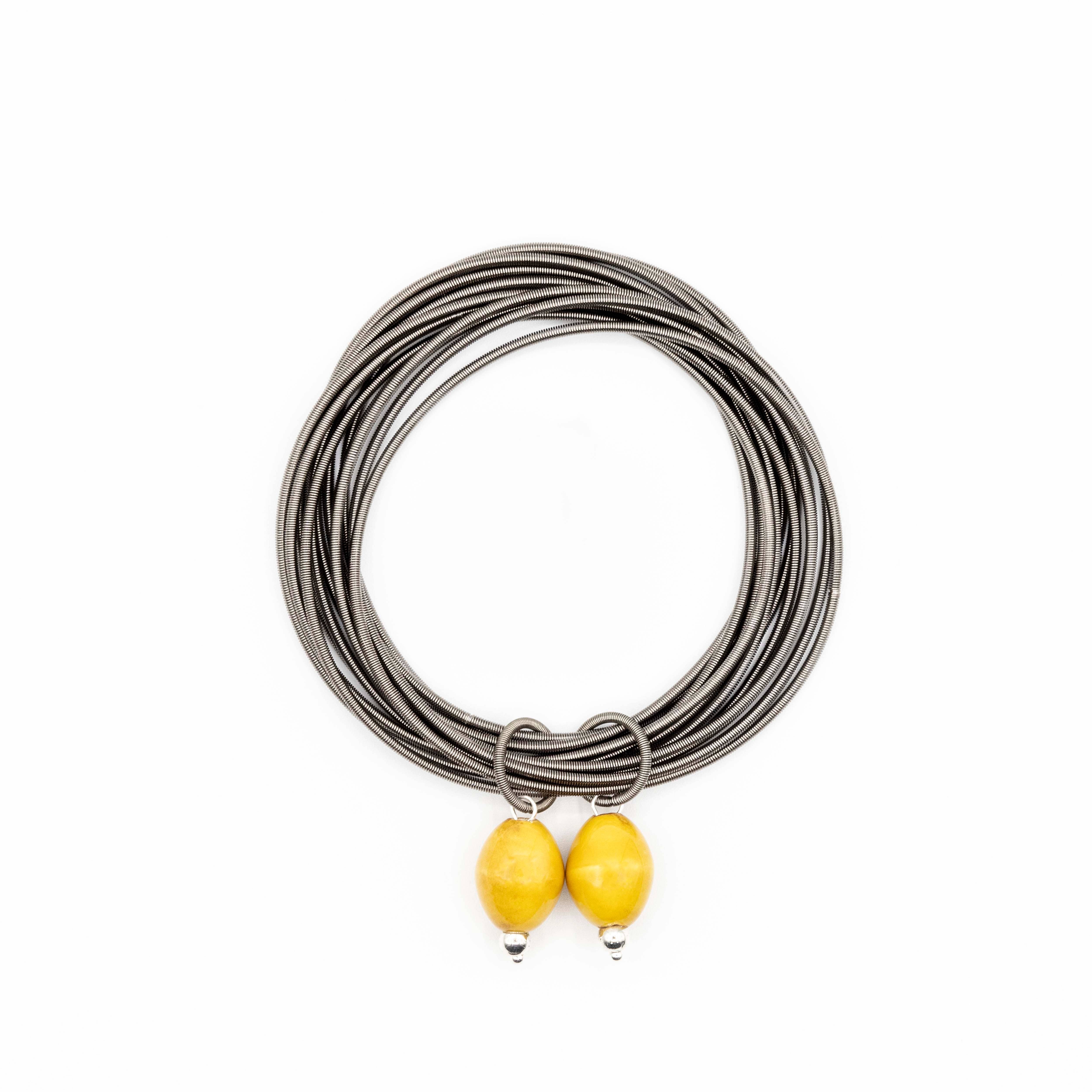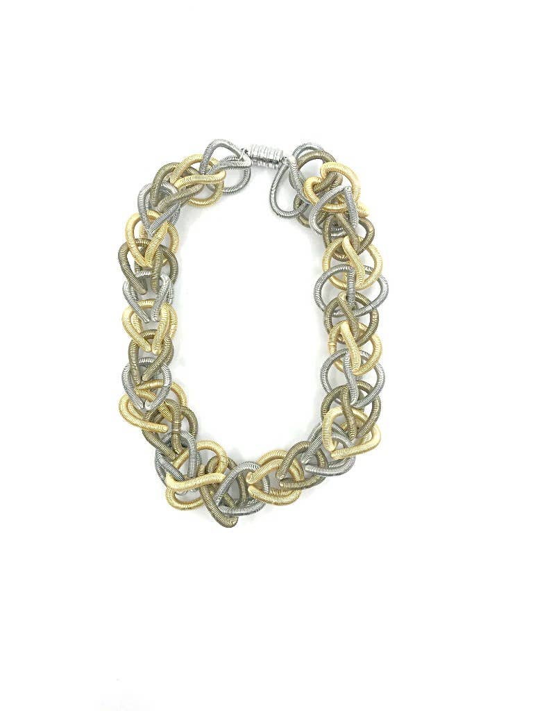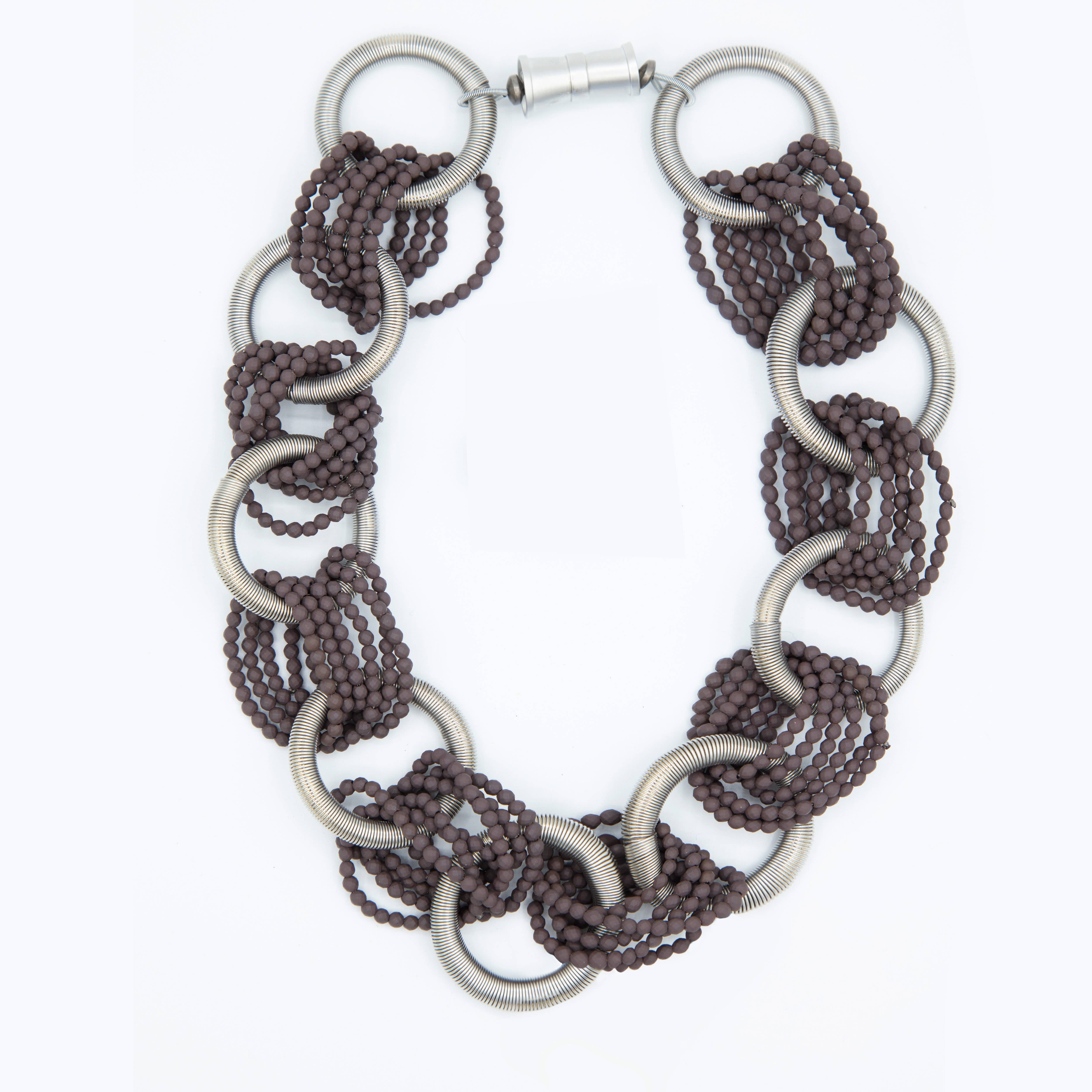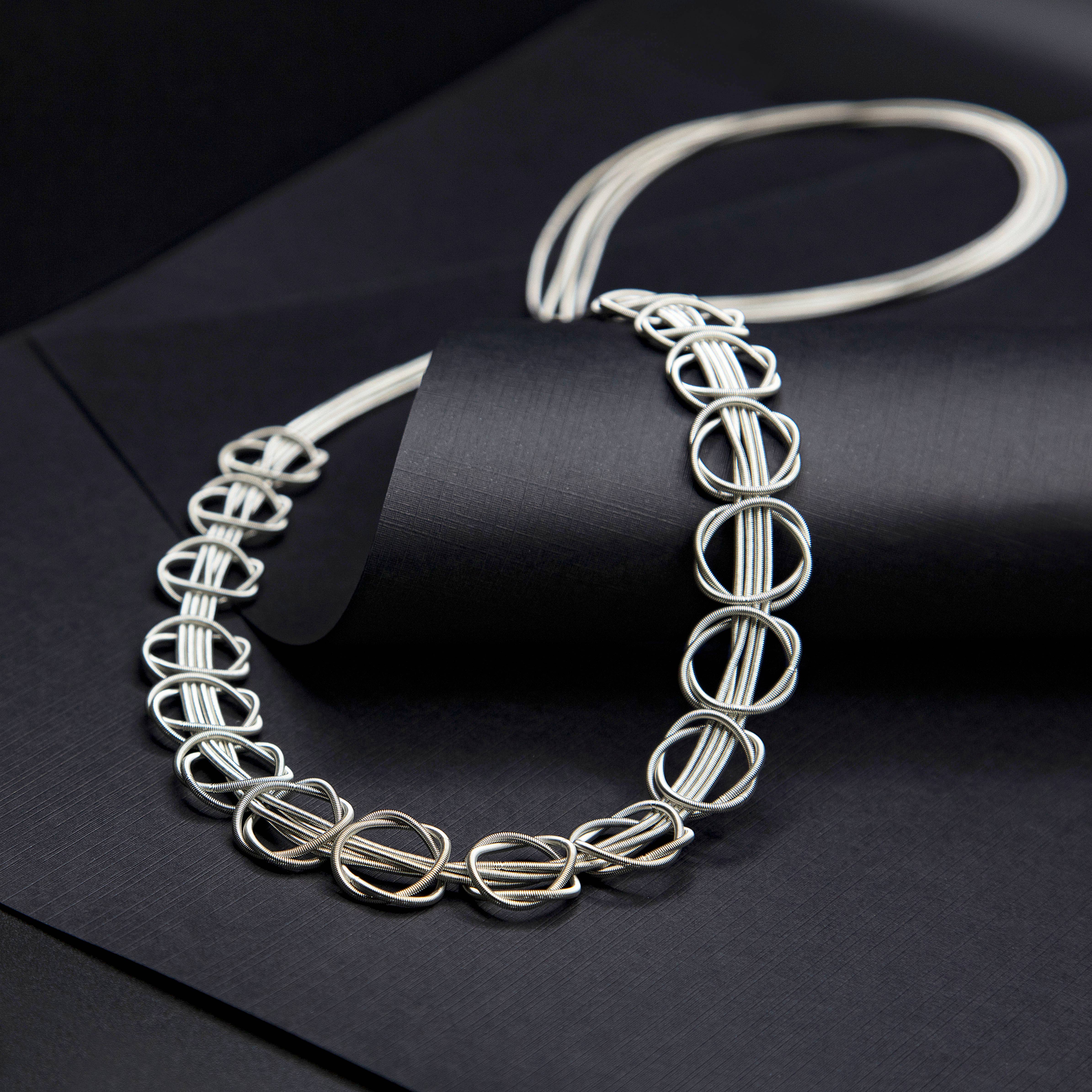 Long Rose Gold Piano Wire Necklace With Interlocking Rose Gold Rings.