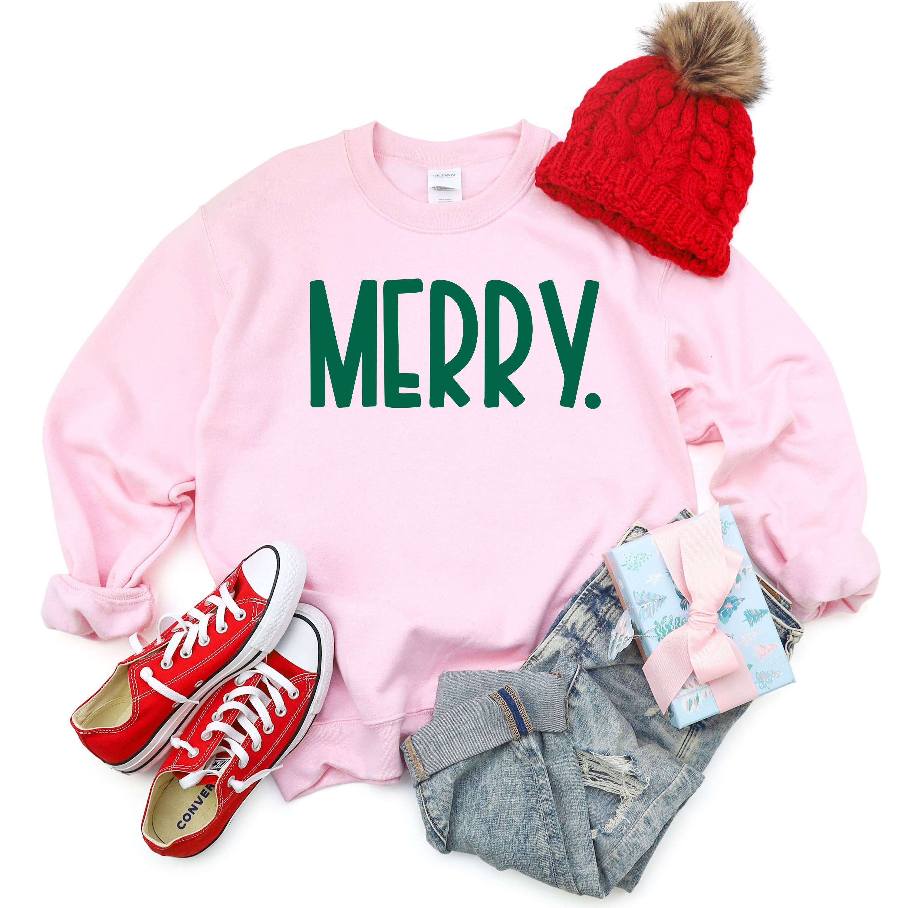 Merry graphic screen printed as shown on the Bella and Canvas shirt or Jerzee brand sweatshirt color of your choice. Super soft and comfortable with a unsex fit. We offer all of our graphics on tanks, tees, and sweatshirts. If you do not see what you are looking for please message us. We also welcome custom orders. Handmade in my small boutique in Easley, SC where I am a wife, mom of 4, and teacher. Thank you for supporting my small business.