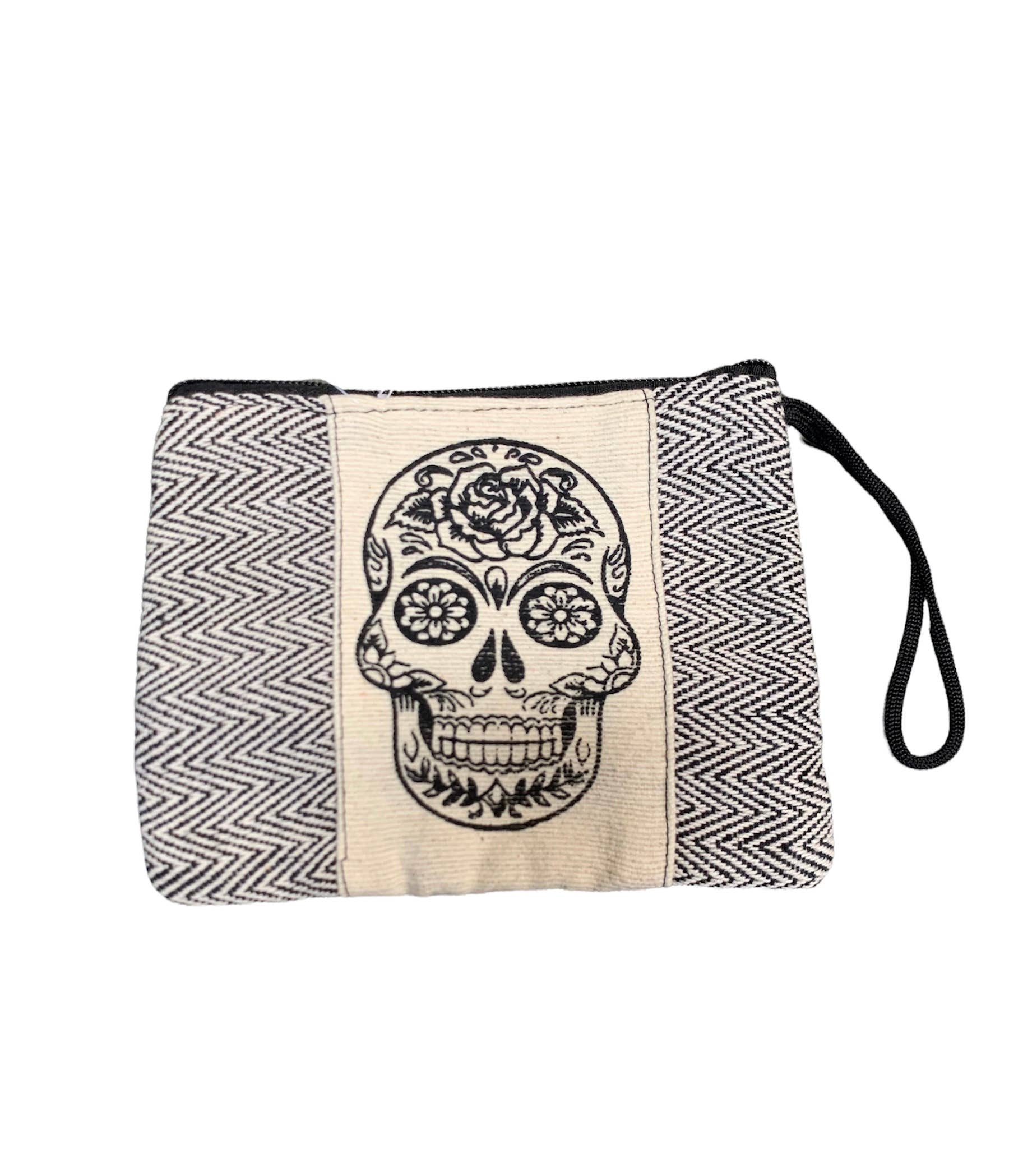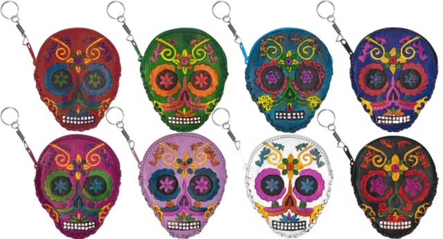 Embroidered cotton and suede skull shaped coin purse pouch bag with Day of the Dead sugar skull head and embroidered flower design. Back side is full brown vegan suede leather. • Item code: SK-CP • Sold in assorted colors. • Approximately 5" x 4" x 0.8" • Sealed with single zipper closure. • Materials: Cotton, Vegan Leather • Handmade in Guatemala. Contact us or search our catalog to order custom display(s) of this product. Disclaimer: Each one of our products are handmade and unique. When ordering wholesale, customer will receive ASSORTED COLOR, AND/OR PATTERN variations of the product.