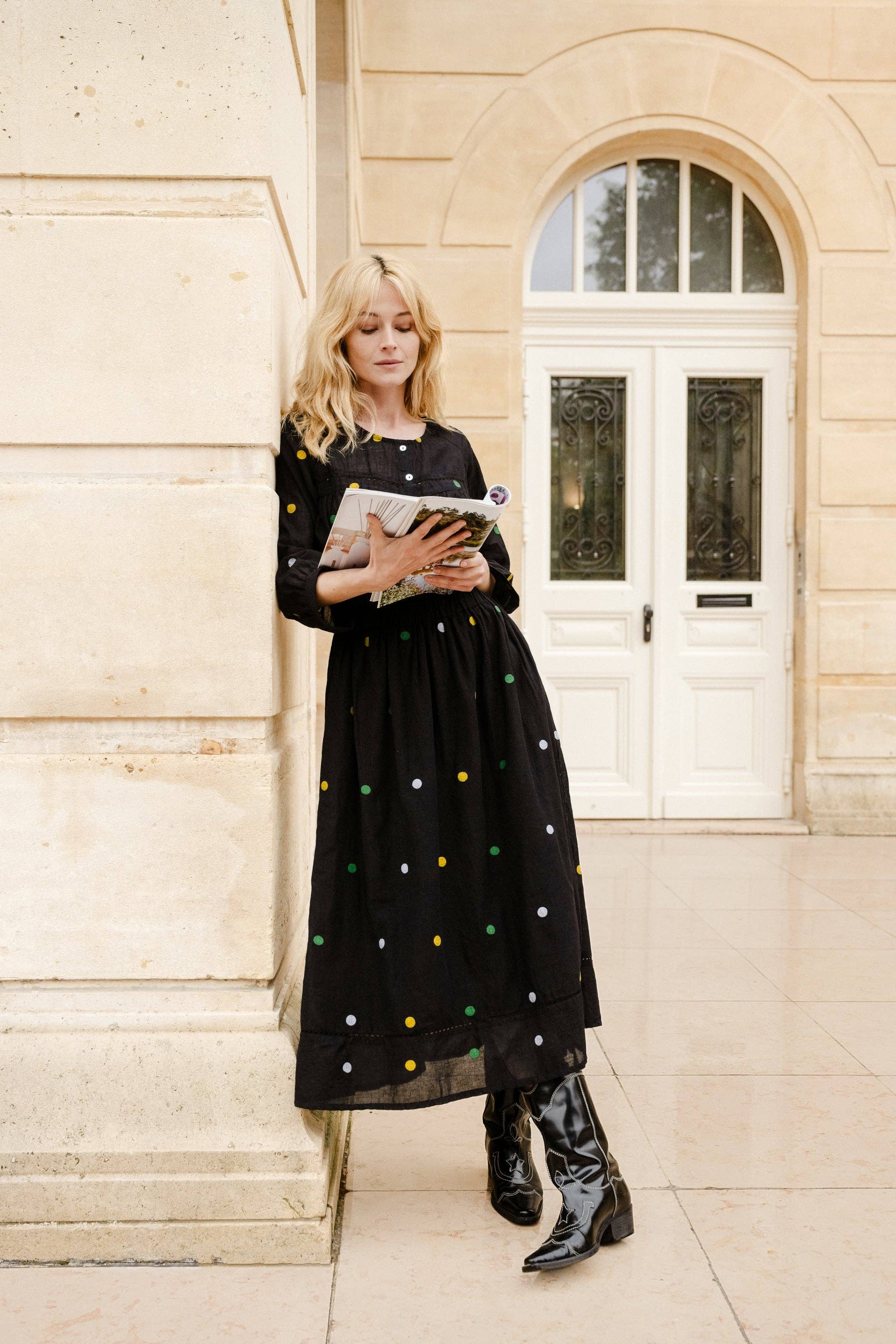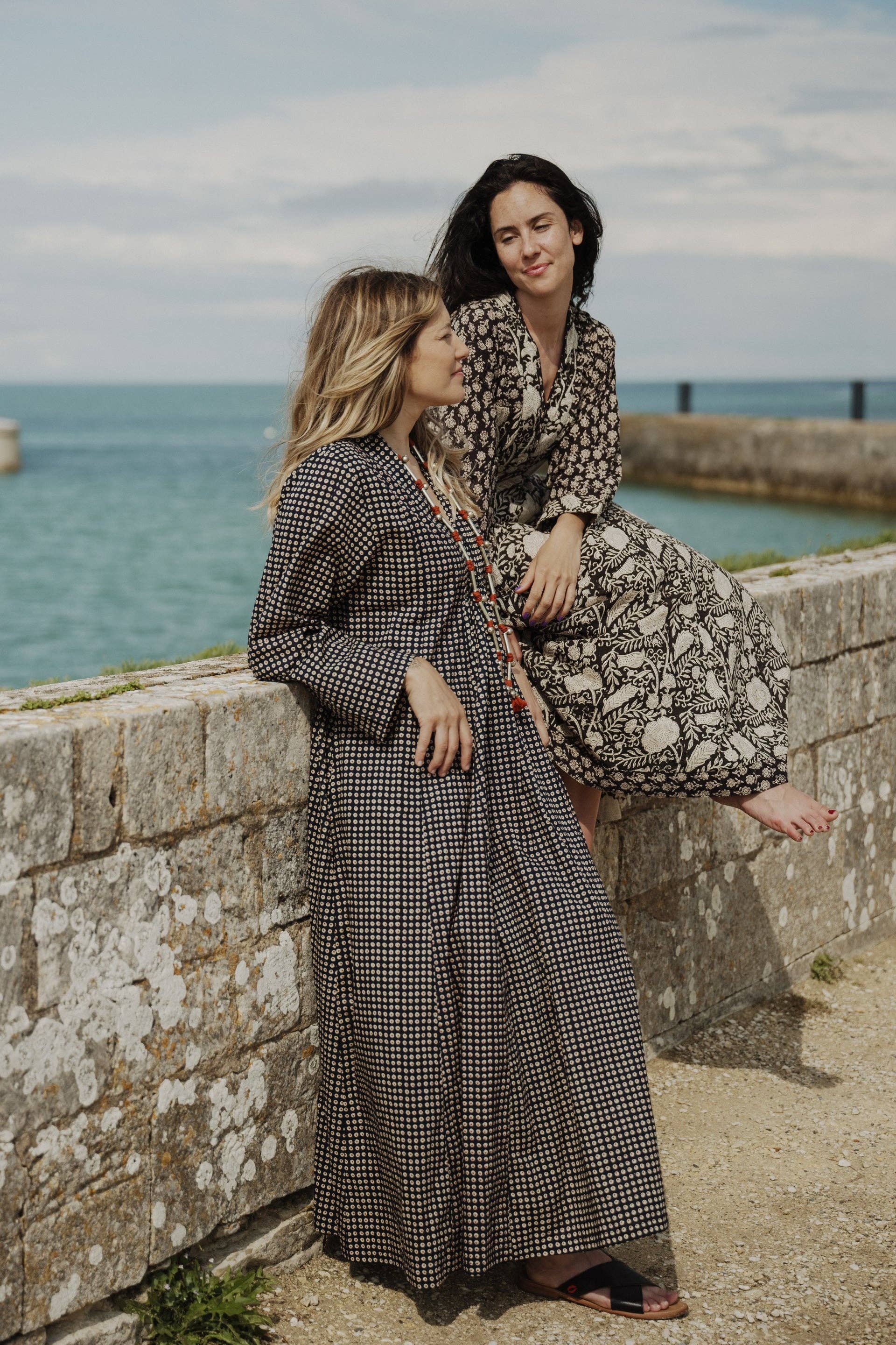 This nightgown-style dress is the perfect piece for a chic casual look. Made of cotton voile, it is light and fluid and will ensure optimal comfort. Long dress, buttoned all the way, V-neck, long sleeves, patch pockets. One size fits all. Suitable for sizes 36 to 44. Our models make a 36. Dimensions: Length: 111cm/Shoulder length: 41cm/Sleeve length: 52cm