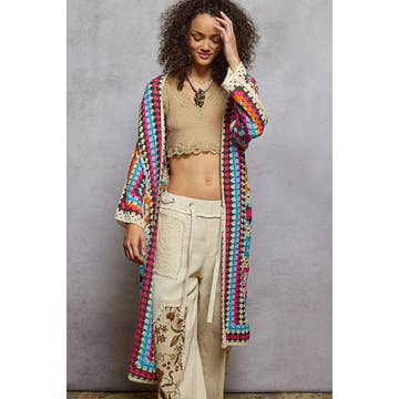 Designed in long sleeve roomy fit cardigan in crochet with various colors and weave knit patterns. Specs/Dimensions: - BUST: 26-1/2" - LENGTH (Front and Back): 52" - SLEEVE: 15-1/2" - SHOULDER: 26-1/2"