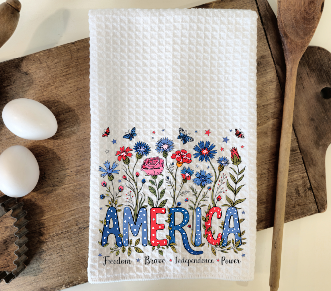 This Fourth of July towel is the perfect addition to your red white and blue patriotic home and kitchen decor, and also makes a great holiday gift. - Measures approximately 16”x 24” - Made of 80% Polyester and 20% Polyamide. - Design is permanently printed - Individually packaged in cellophane sleeve and ready to be gifted - It is called a waffle weave because the towel has raised looped edges on the surface of the towel in the shape like that on a delicious Belgian Waffle. These “pockets'' that are created hold water while the surface of the cloth stays dry making it an exceptional drying towel! The raised looped edges on this lint free towel make it great for all around use, while also being great on glass.