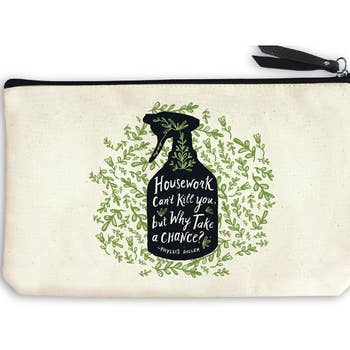 There is nothing more dangerous than a smart woman.. This lined, zipper pouch is an iconic mainstay and a huge bestseller in the Pretty Clever bag collection, especially for customers of gift shops, spas and bookstores. A practical, pretty and often humorous bag, It is the perfect size for carrying a small tablet, books, glasses, a cellphone and more. Each bag is hand-sewn, lined and available in two sizes to fit your entire customer audience - 11 inches wide and 9 inches high (Large) or 9 inches wide and 7 inches high (Small). All bags are lined with sturdy cotton fabric in various colors, set off by a black zipper and binding. Lining colors and patterns will vary in color and design. We are passionate about the power of words, whimsy, and humor, which is why we have included inspiring, funny and quotable words on each bag. Features- *Strong, Linen-colored canvas zip bag *Available in two sizes (small and large) *Lined with colorful fabric *Black zipper with zipper pull