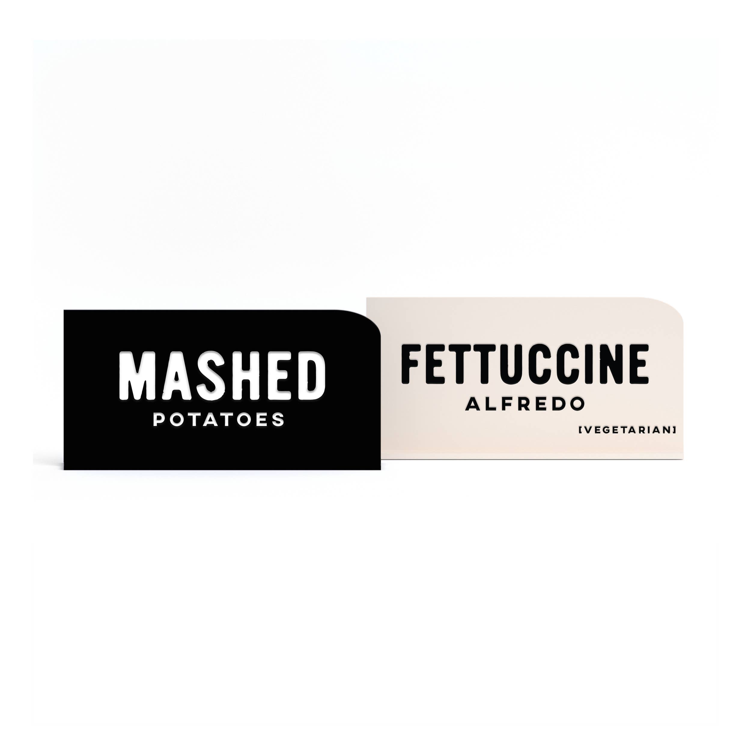 Kindly note: If a white or ivory color is selected, the text will be black. For all other colors, the text will be white. Wood will be engraved. Our acrylic food signs add a unique touch to your buffet table! It's modern and elegant design makes these food labels one-of-a-kind. Much different from the normal paper table tent cards, these food buffet cards are a great way to spruce up your event décor. Mix and match and choose from a variety of colors to match your event theme. The text is hand-painted into the acrylic material which makes the food details look clean and legible! Kindly note: If a white, clear, frosted clear, or ivory color is selected, the text will be black. For all other colors, the text will be white. Includes the arch sign + base Measurements: 4" W x 2.5" H Material: high quality acrylic