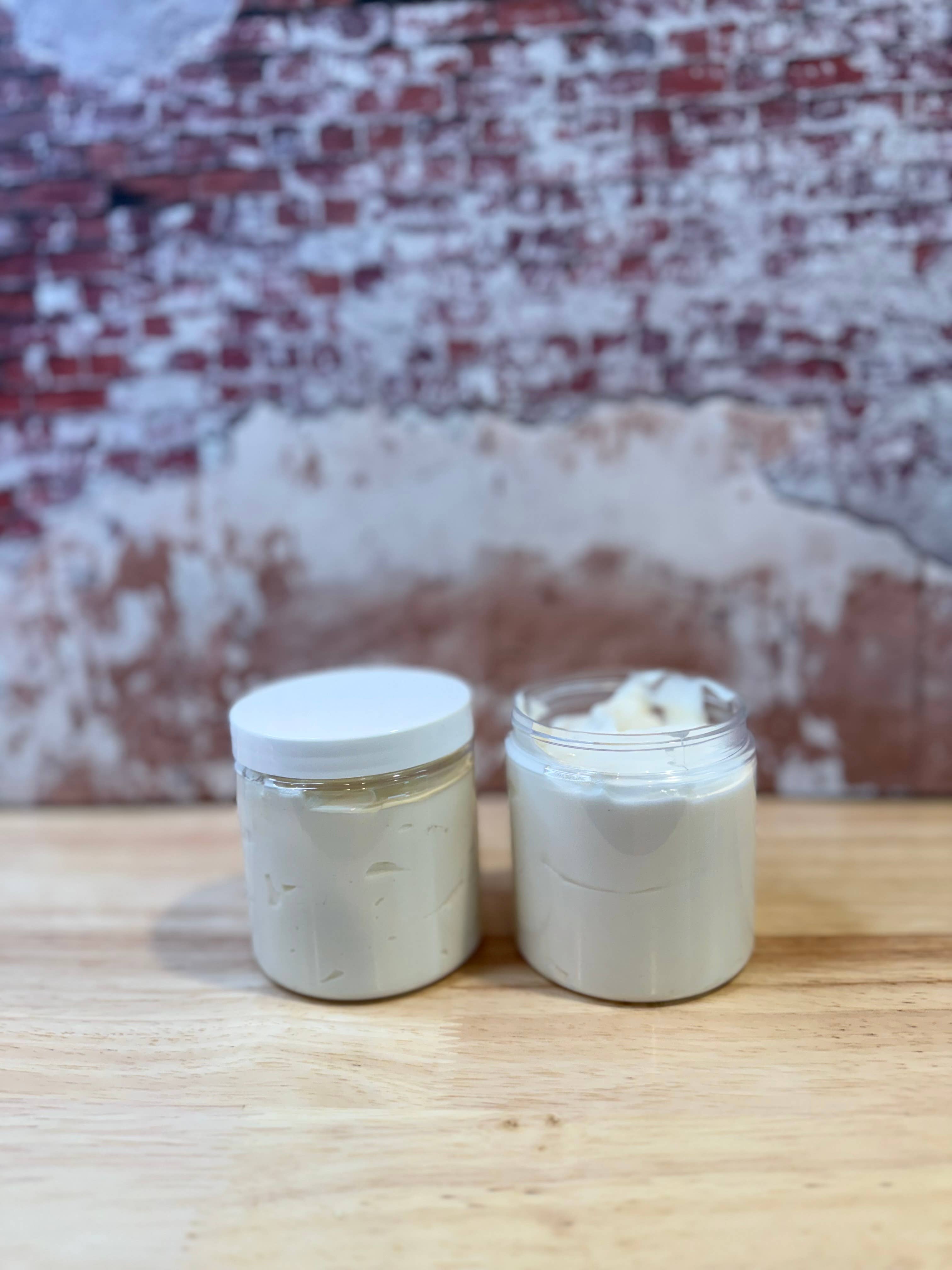 Whipped Body Butter Our light and fluffy Whipped Body Butters are smooth and creamy. They simply melt in your hands! We always use organic unrefined shea butters and organic coconut oil for it’s high benefits to the skin naturally. The added Grapeseed Oil we use are high in Vitamin E, a powerful antioxidant protecting skin cells. Comes in 8 oz jars Ingredients: Organic Unrefined Shea Butter, Organic Coconut Oil, Grapeseed Oil, Essential Oils