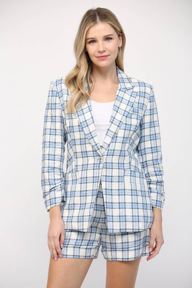Crafted meticulously with a blend of comfort and style, this set features a tailored double-breasted blazer paired with matching shorts. The soft pink hue combined with the classic houndstooth pattern exudes an aura of feminine grace, making it a must-have for every wardrobe. Silver buttons add a touch of luxury, ensuring you shine in every setting. Whether it’s a business meeting or an evening soiree, this suit set promises to be your go-to choice, offering versatility and elegance in equal measure.