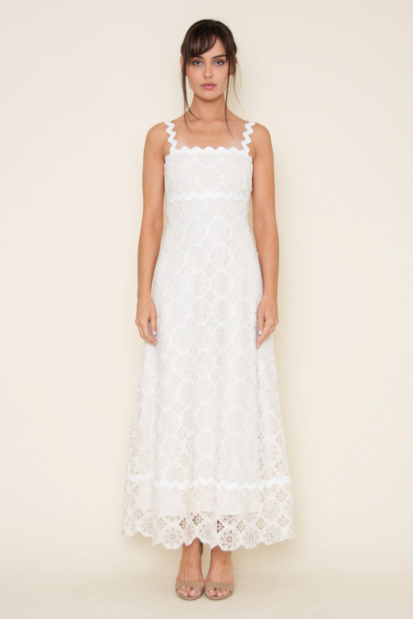 Style: JD4552 Monochromatic embossed floral midi dress. It exhibits a straight neckline, spaghetti straps, and a gathered empire waist. It also has a babydoll silhouette and a back invisible zipper. Storia