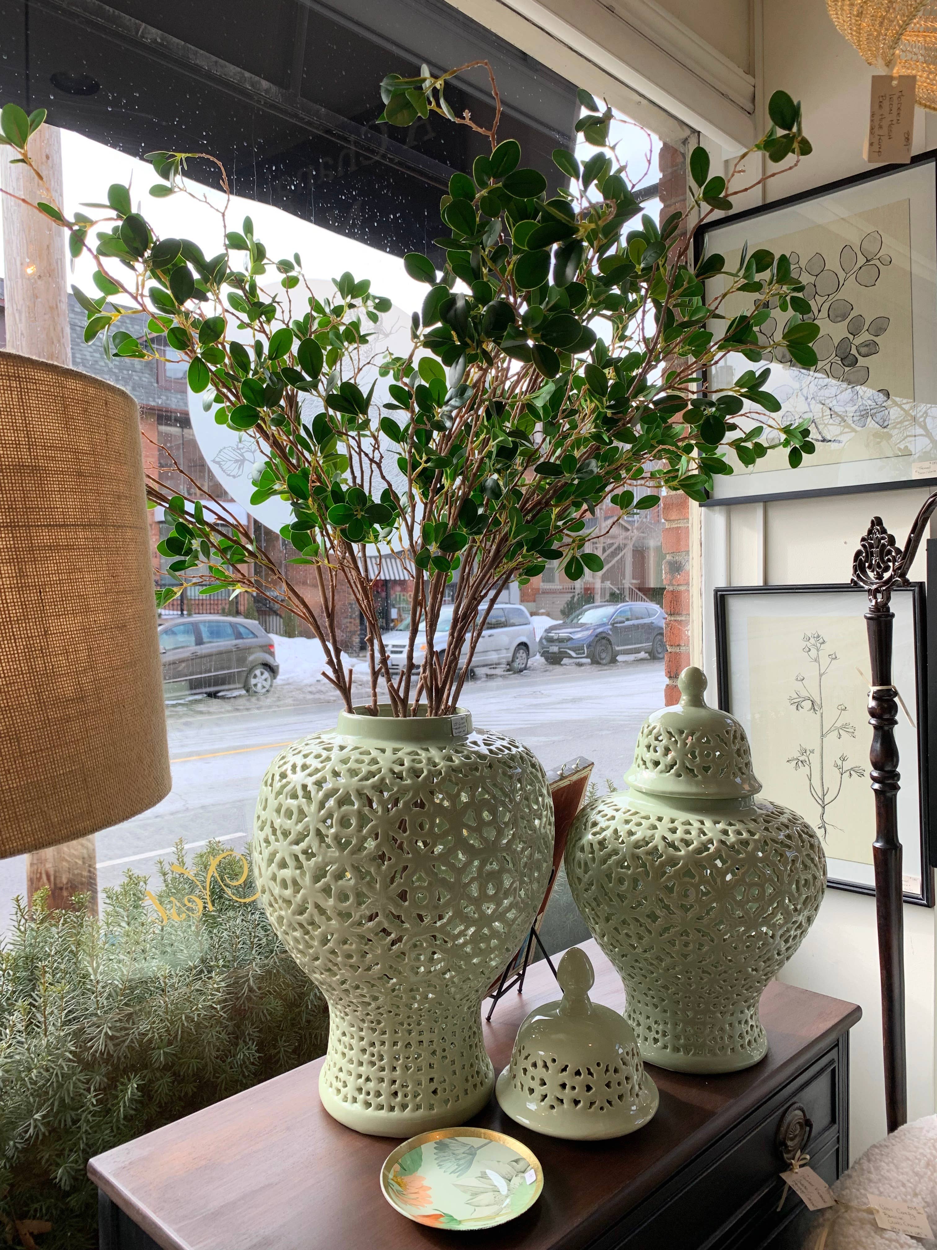 The 19.5” Galt International Lattice Jar with Lid is a stunning piece of living room decor and kitchen decor perfect for any room in your home! This tall vase is complete with intricate lattice work similar to many modern and traditional Mediterranean designs. Size: 11.8” x 11.8” x 19.5". Add a touch of sophistication to your home with our Pierced Lattice Ginger Jar. Crafted from high-quality materials, this beautiful jar features a stunning pierced lattice design that will elevate the style of any room. Measuring approximately 19.5 inches tall, this jar is perfect for use as a decorative accent piece on a shelf or mantel. Its intricate design and elegant shape make it a stunning addition to any decor style, from traditional to modern. This versatile jar is both functional and stylish, making it a great investment for any home. Use it to store small items or simply display it as a beautiful decorative Wipe clean with a damp cloth. Material: ceramic. Size: 11.8X11.8X19.5.