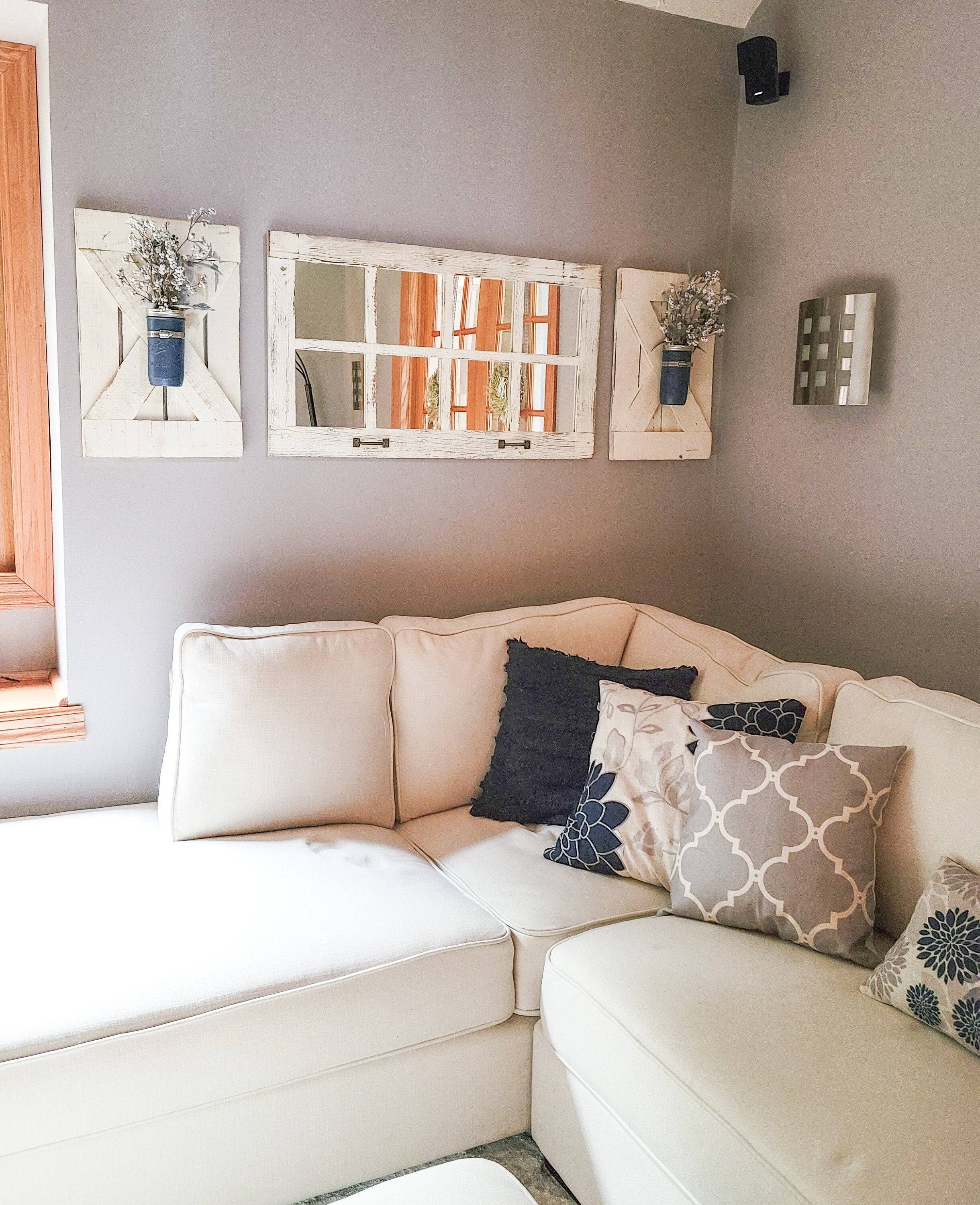 8 Pane Farmhouse Wall Decor Window Mirror - Rustic Window Mirror - Rustic Mirror - Large Window Mirror - Window Pane Mirror Brighten up your space by placing this meticulously crafted window mirror into your living room, entryway, bedroom, or bathroom. The mirror set adds rustic charm and a modern farmhouse element to your space. We love our customers! We also love how they display their amazing Rusty Mill Farmhouse wall decor mirrors in their home. Diane G. did a beautiful job decorating her space with her Rusty Mill large rustic mirror + shutters. Thank you for sharing your space with us Diane! ------------------------------------------------------------------------- NOTE: Clear mason jar decor can be ordered at the link below. (Example: Mirror+X Shutters+Jars) It will come with 2 clear (not painted) mason jars, pipe clamps, and green floral.
