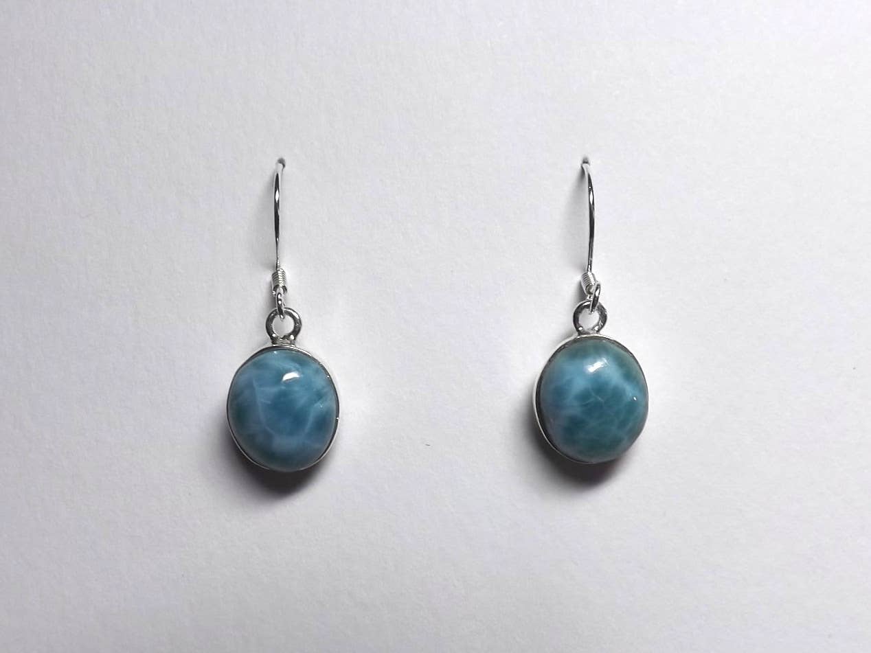 Oh, these are so pretty. Dreamy larimar briolettes are topped with a freshwater pearl and a tiny blue topaz. Accents and ear wires are sterling silver. These measure a little over an inch long. Larimar is only found in the Dominican Republic.