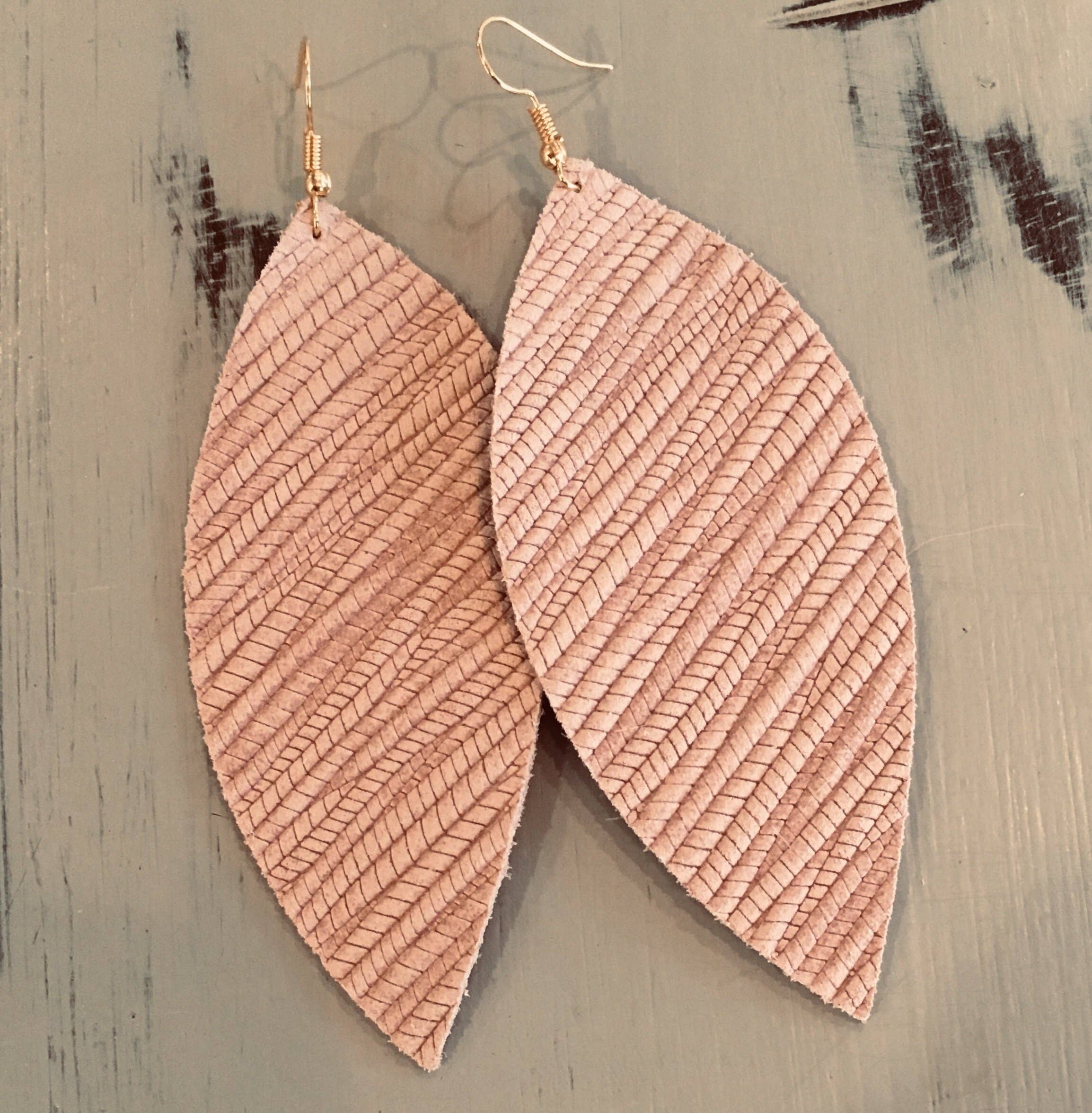 These are a pair of leather and earrings. Striped black and white leather paired under cognac brown leather. Earring is a fish hook style and will come with the little rubber backing on the end. These awesome earrings would make the perfect addition to any outfit. Earrings measure 3" in total length and are 2.5" wide.