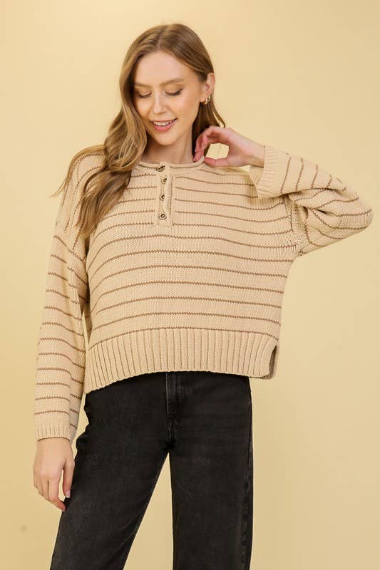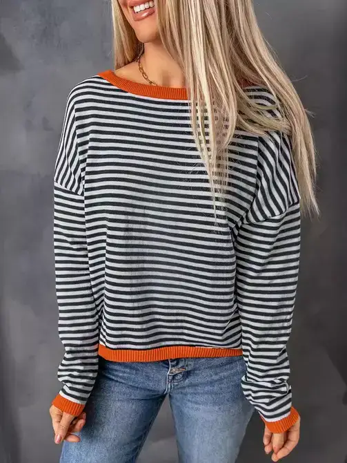 - Ribbed Crew neckline - Striped knitted sweater - Casual drop shoulder - Long-sleeve ribbed hem - Lightweight and breathable - Pullover style - Comfortable, Relaxed fit - Perfect for daily casual outings, this sweater is suitable for various occasions. Pair it easily with jeans or skirts for a trendy, everyday look. - Match with VP81178 - Lightweight and breathable for spring and fall casual sweater * Model is 5'8, 32-27-37, wearing SMALL