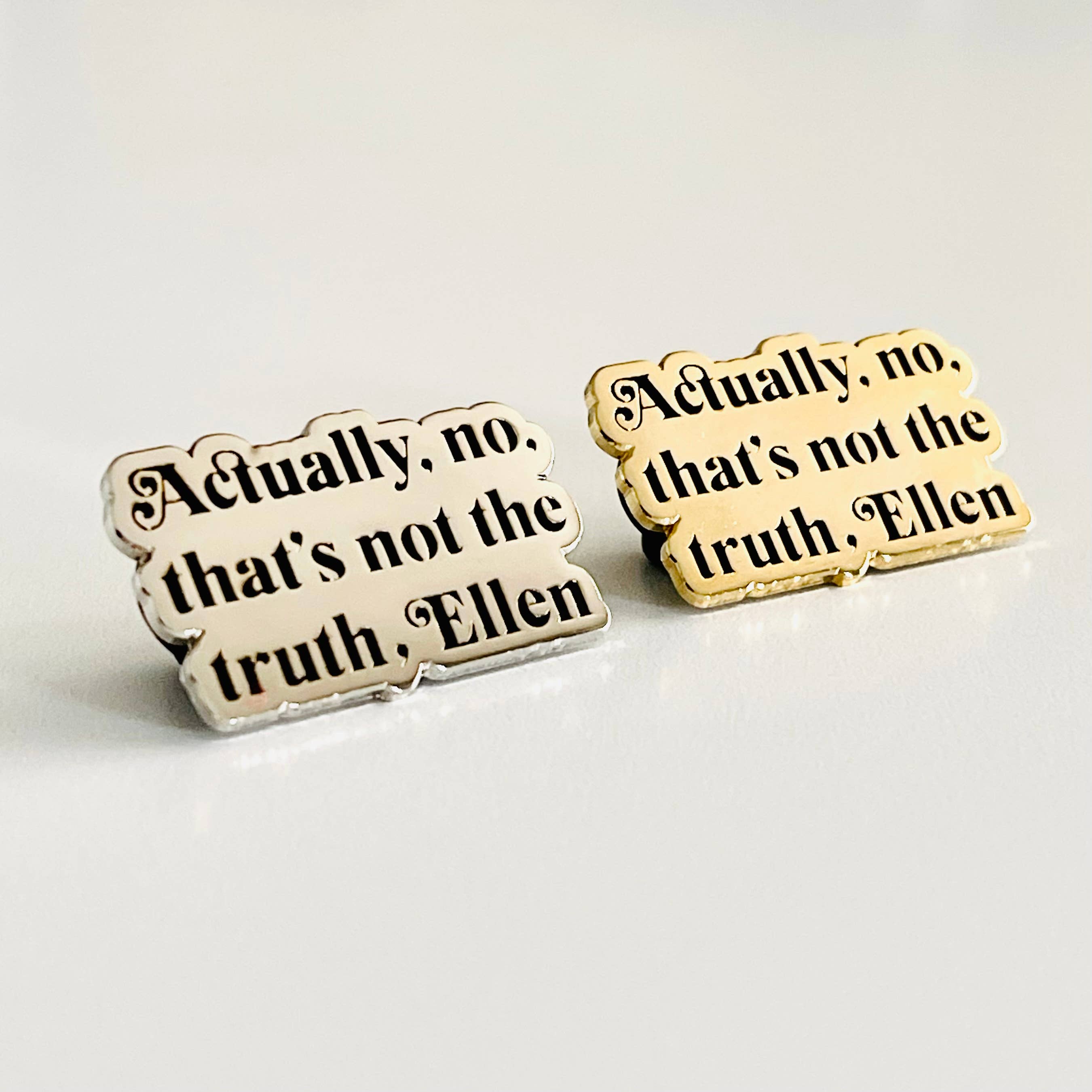 Made in United States Audience: Everyone Color: Gold and White Is Set: Individual Material: Enamel and Rubber Occasion Theme: Christmas, Everyday, and Love Season: Year-Round Theme: LGBTQ+ Tone: Funny Product Language: English Weight: 17.01 g (0.6 oz) Dimensions: 3.8 cm (1.5 in)