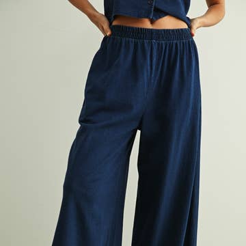 SKU: UQS2379DNMXS Made in United States Aesthetic: Casual and Classic Color: Blue Embellishment: Pleat Fabric: Cotton Pant Style: Baggy and Wide Leg Rise Style: High Weight: 0.55 kg (1.21 lb)