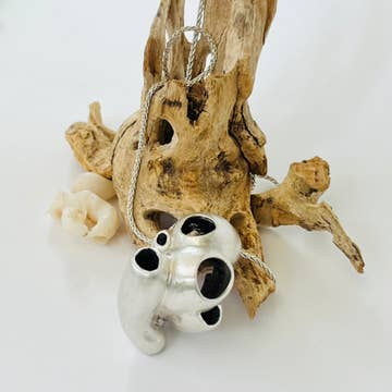Opossum Skull Pendant Didelphis virginiana - Opossums are best known for "playing possum" when threatened. This is an involuntary response where the creature will feign the appearance of death. Upon birth, these marsupials immediately crawl into their mother's pouch to continue developing. As they grow, they will go in and out of the pouch and will often ride on the mother's back as she hunts for food. This piece features a hinged jaw. Includes matching 24 inch chain. Wooden display base optional. Skull Dimensions: 30mm x 16mm x 14mm