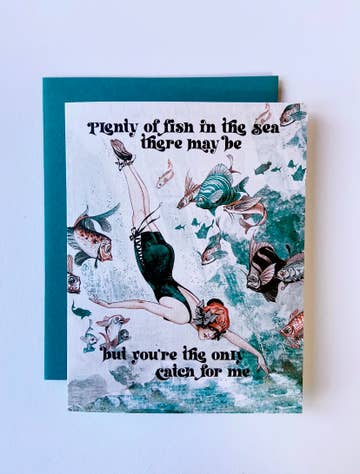 "There are plenty of fish in the sea" Interior: "You are the only one for me" Hand-drawn illustration letterpress card 100% Cotton paper, white Folded A2, 4.25 x 5.5 inches Comes with a light blue A2 envelope Packaged in a clear biodegradable sleeve This greeting card was printed with love using the Chandler and Price antique letterpress machine built in 1902. Each color is hand fed through the press. Printed in customized vibrant colors with rubber-based ink. Color may vary from photos to printed products.