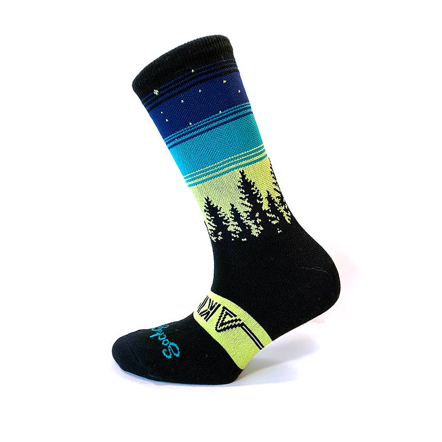SKU: sundownersocks-SM Made in United States Aesthetic: Active and Casual Care Instructions: Machine wash Color: Multi-Colored Fabric: 75% Turbowool (50% Merino Wool, 50% Polypropylene), 15% Nylon, 10% Spandex Fit: Unisex Occasion Theme: Everyday Occasion: Everyday and Outdoor Adventures Pattern: Graphic Season: Core Sock Style: Sport Product Language: English Packaging: Reduced Production: Ethically sourced