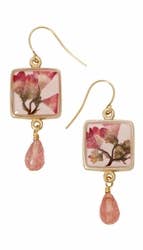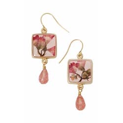 Bring home cottage style with genuine pressed flower jewelry! These delicate clear rectangular earrings feature dried red flowers and green leaves embedded in clear resin with a gold border. Natural and sweet vintage design with red genuine flowers. * Made in China * Genuine pressed flower earrings * Measures: 2" x 3/4" * Materials: Gold Tone Metal, Dried Flowers, Resin * *