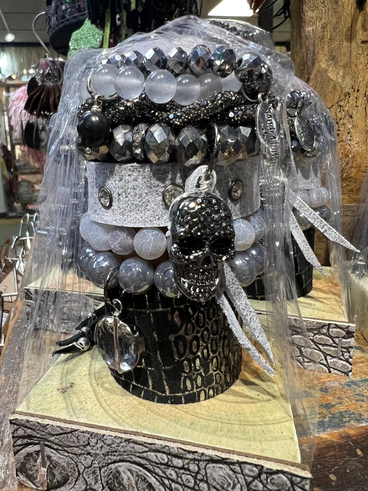 Step into the spotlight with the Backstage Pass XL Stax, a striking black-and-white bracelet stack designed for those who live loud, love bold, and shine bright. With a perfect mix of glam crystals, Western textures, and rockstar edge, this oversized stack is ready to perform. Details you’ll love: Oversized iridescent crystal centerpiece framed in rhinestones Black-and-white hide cuff for a Western-meets-rock vibe Peace sign charm and rhinestone-studded guitar pendant for true stage energy Faceted beads in black, white, and clear with metallic spacers for extra shine Sparkling medallion charm for a finishing touch of glam This XL stack is pure music-festival meets fashion-show—perfect for markets, concerts, or anyone who wants to rock their wrist with bold style. ⚡ Limited Edition – Backstage Pass XL Stax: Turn every moment into an encore.