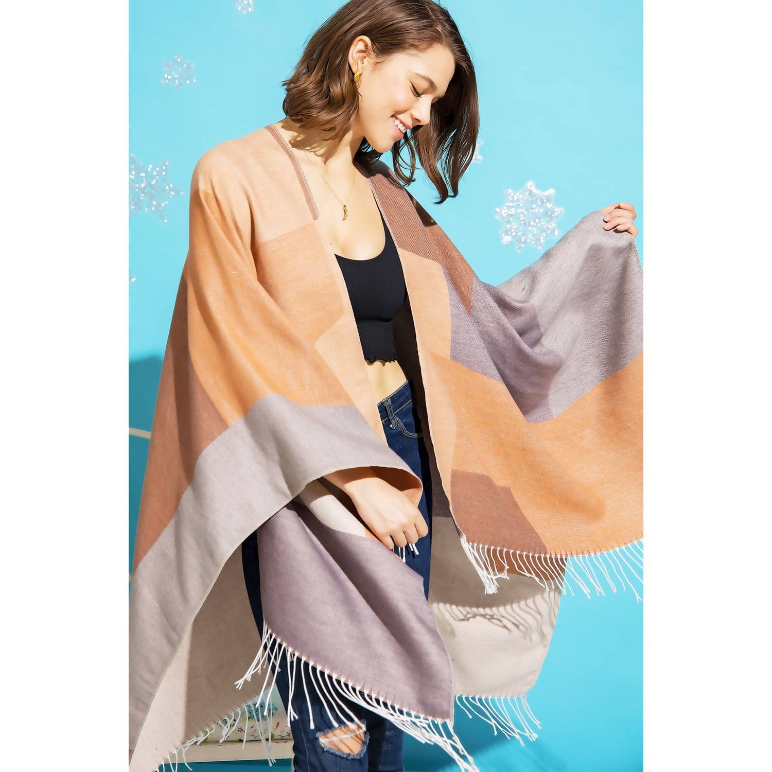 Color Block Fringe Poncho Sweater