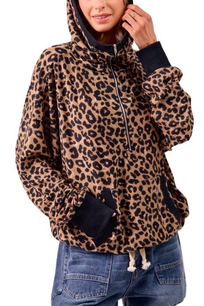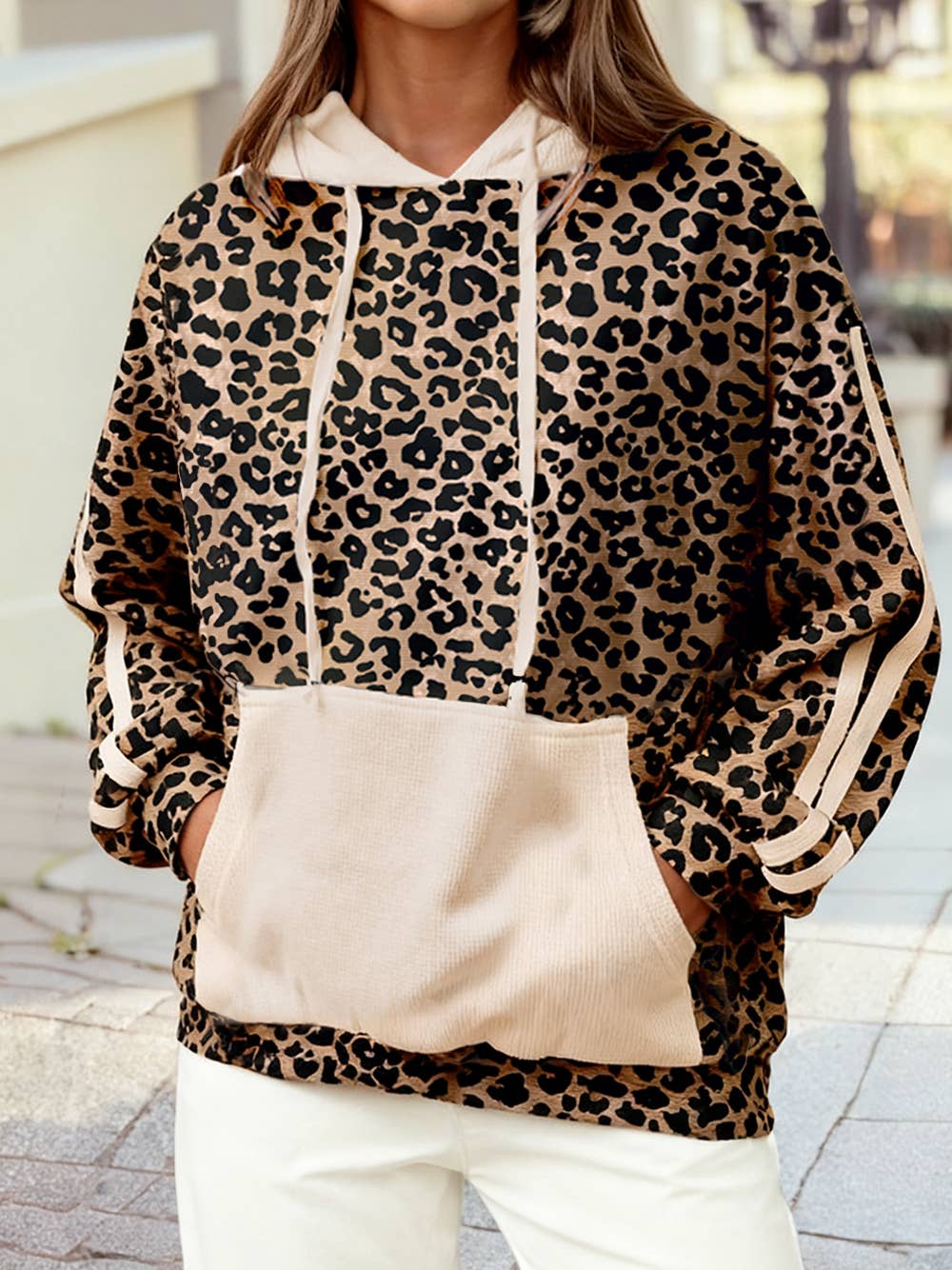 Leopard Striped Sleeves Drawstring Pullover Hoodie T4436