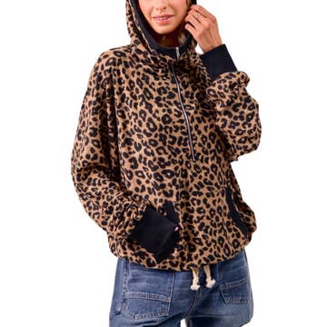 A COLOR BLOCK HOODIE FEATURING A STRIPE CONTRAST, ANIMAL PRINT, RAGLAN SLEEVE, TWILL TAPE DRAWSTRING, HOODIE, V STITCH, AND LONG SLEEVES. *MODEL IS WEARING SIZE SMALL