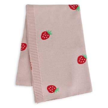 Sweet and whimsical blanket, adorned with vibrant red strawberries and featuring Bailey Bunny. Crafted with utmost care, this blanket is made from 100% GOTS certified organic cotton. Wrap your precious bundle in comfort and style with this eco-friendly, irresistibly cute baby blanket that promises both warmth and peace of mind. Match with the strawberry or bunny hat, cardigan, teether or lovey. - Designed in Utah - Measures 32 x 40 in - 100% GOTS Organic Cotton Care Instructions: Machine wash cool. Do not bleach. Tumble dry. Cool iron if required.