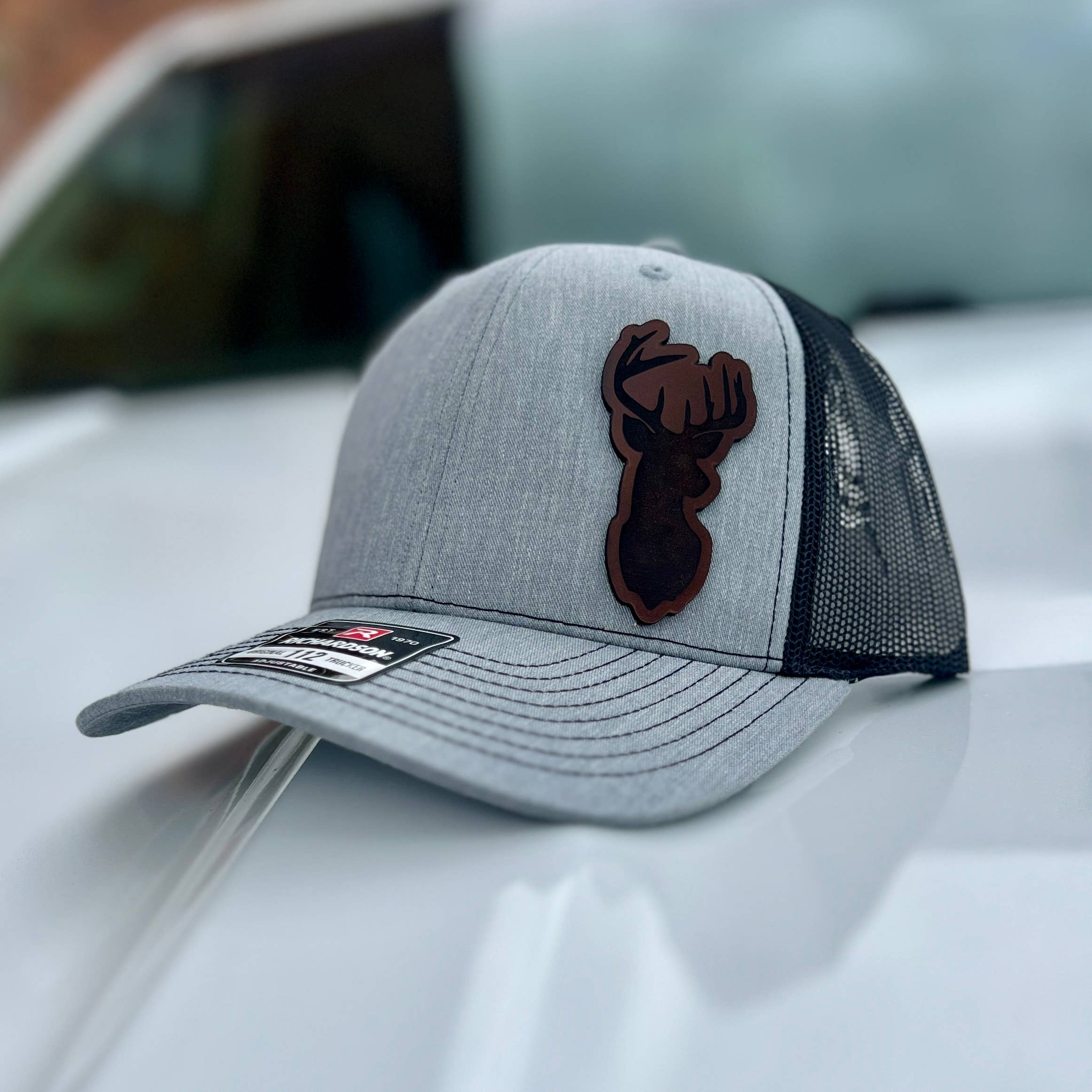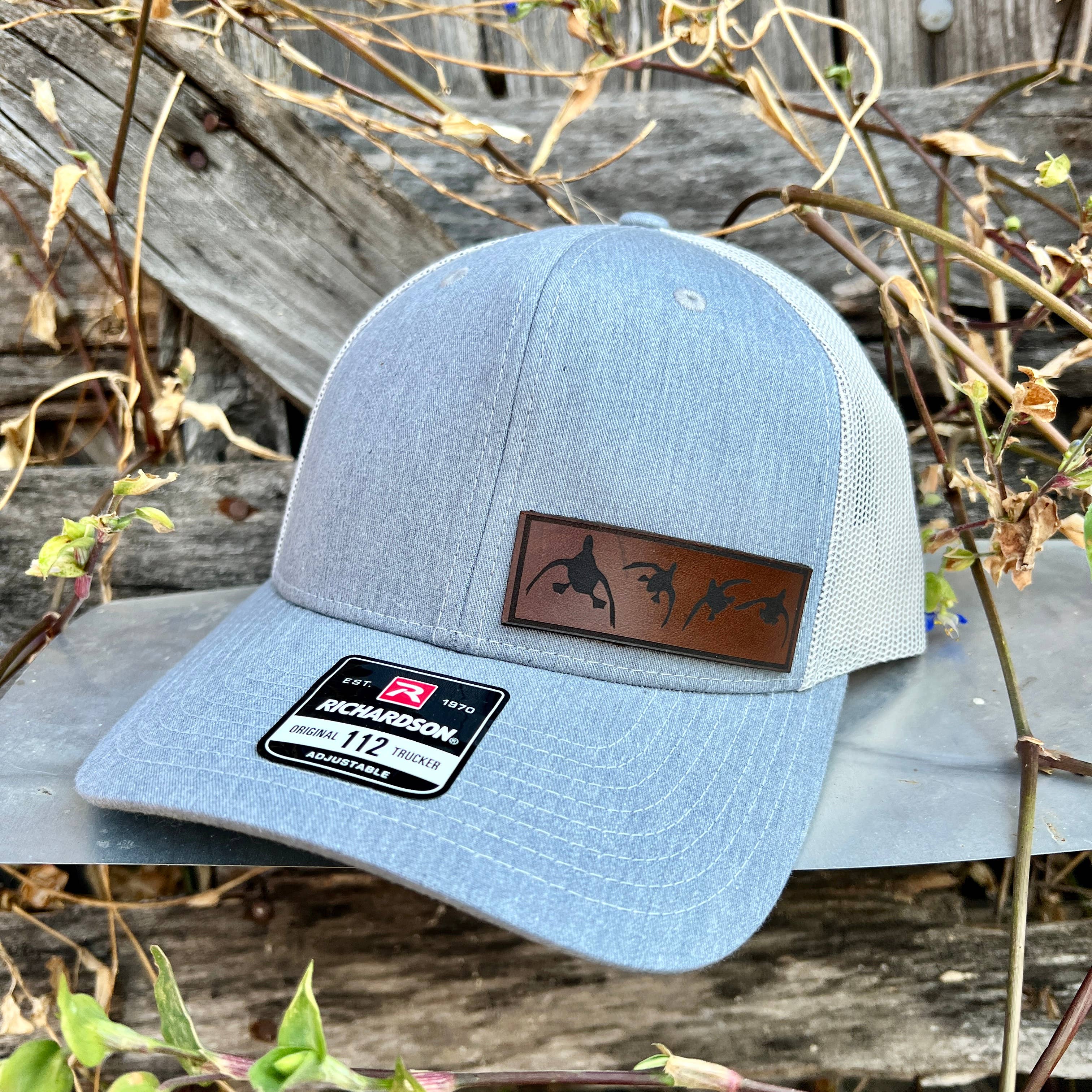 Richardson 112 snapback baseball cap in Charcoal Grey/Black color. Genuine Leather patch with "Eat More Beef" graphic design.