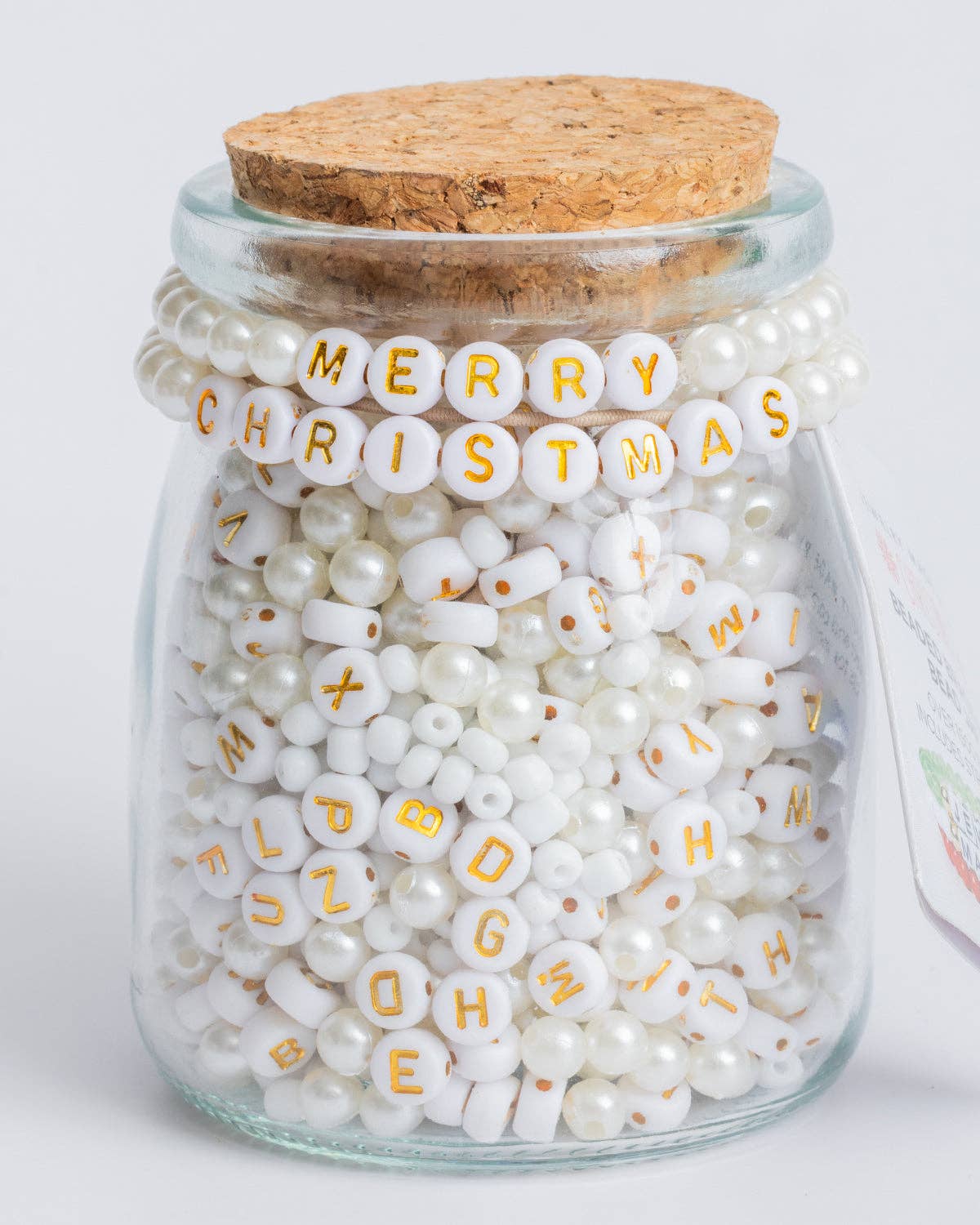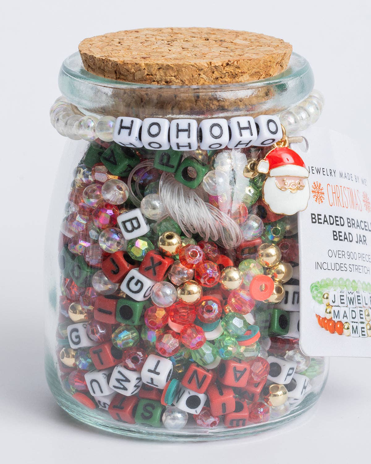 Merry Christmas stretch bracelet DIY bead kit with over 700 beads and 5 yards of stretch cord. Metallic silver round letter beads with bright blue, clear, and silver spacer beads to make and gift custom beaded jewelry and more.