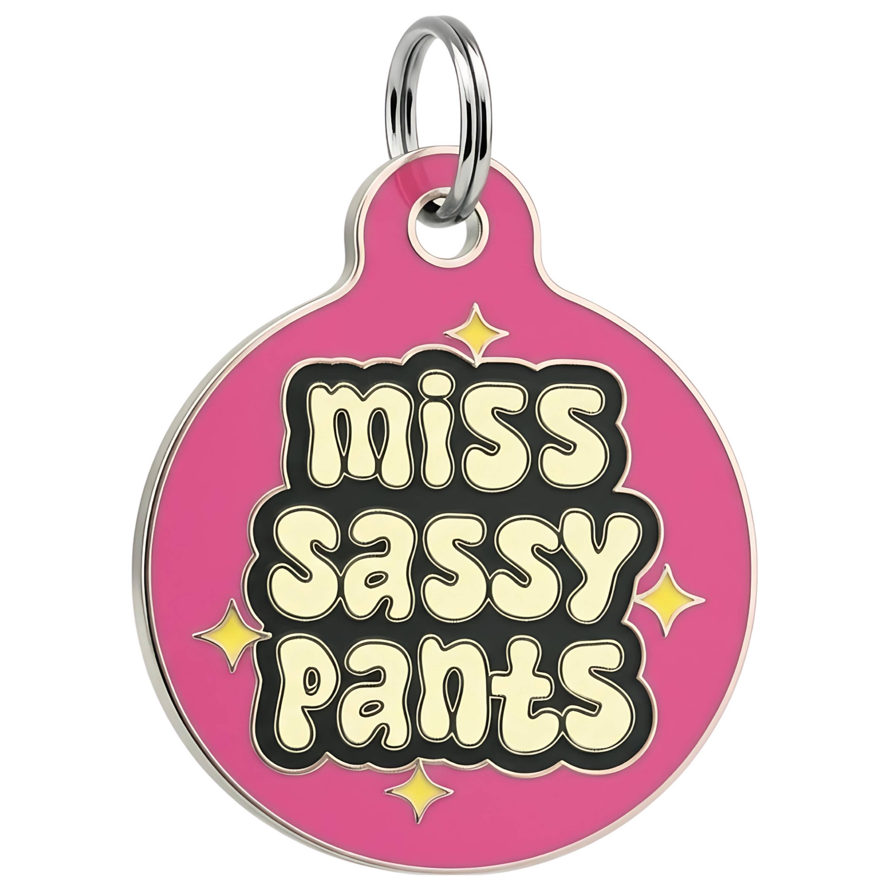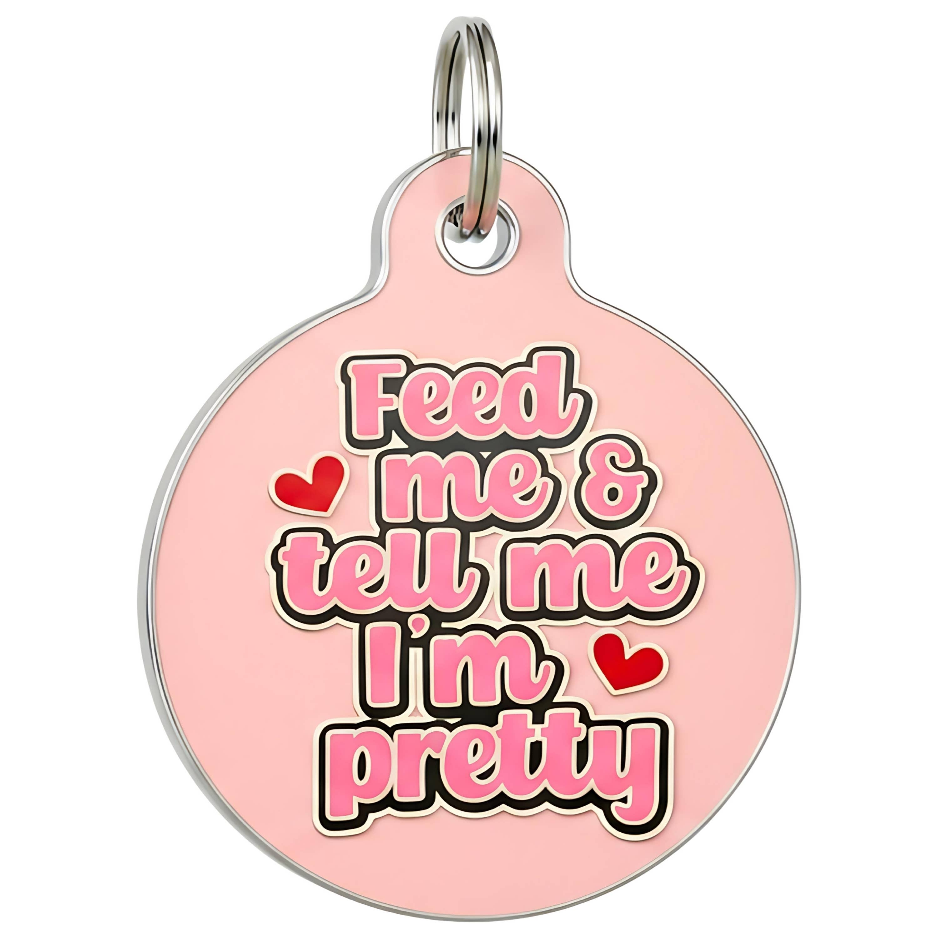 The “Feed Me & Tell Me I’m Pretty” dog charm is perfect for pets who live for snacks, compliments, and being the main character. With a soft pink background, bold bubble lettering, and tiny heart details, it adds instant personality to any collar. Choose the QR code option for easy, scannable ID that helps keep pets safe! 🌟 30K+ Five-Star Reviews ❤️ Loved by 100K+ Pets Since 2014 🔥 500K+ Social Followers = Strong Brand Recognition 💎 Premium, High-Quality - No Plastic or Acrylic 💪 Chew, Drool, and Zoomie Tested PACKAGING All tags arrive retail-ready, secured on a durable hang card with a peg hole for easy in-store display. A small metal keyring is included. Coordinating countertop displays are available in our shop. TAG SIZES • Small: 1" wide, recommended for cats and small dogs • Large: 1.25" wide, ideal for medium to large breeds MATERIAL • Durable 1.5mm thick enamel metal • Bronze core, nickel-coated finish • High-quality, premium pet tag— not plastic or acrylic BACKSIDE OPTIONS: 1. QR CODE (Most Popular!) A unique QR code is engraved by Bad Tags prior to shipping. Activation instructions included. Includes a free online pet profile with their name, phone number, and email. • No app required • No subscription fees • Quick, simple, and reliable scannable identification 2. COLLAR CHARM The back is left blank for custom engraving, making this option ideal for shops that engrave in-house. Sample tags are available for machine testing—please send a message to request. We do not currently offer drop-shipping. ✅ Top-Shop A+ Customer Service 🇺🇸 Uniquely Designed in USA - Woman Owned ❤️ Rescue Supporter We are the original Bad Dog Tag Company — designed, produced, and trusted by pet parents for over a decade 💯 Questions? Send us a message — we’re happy to help!