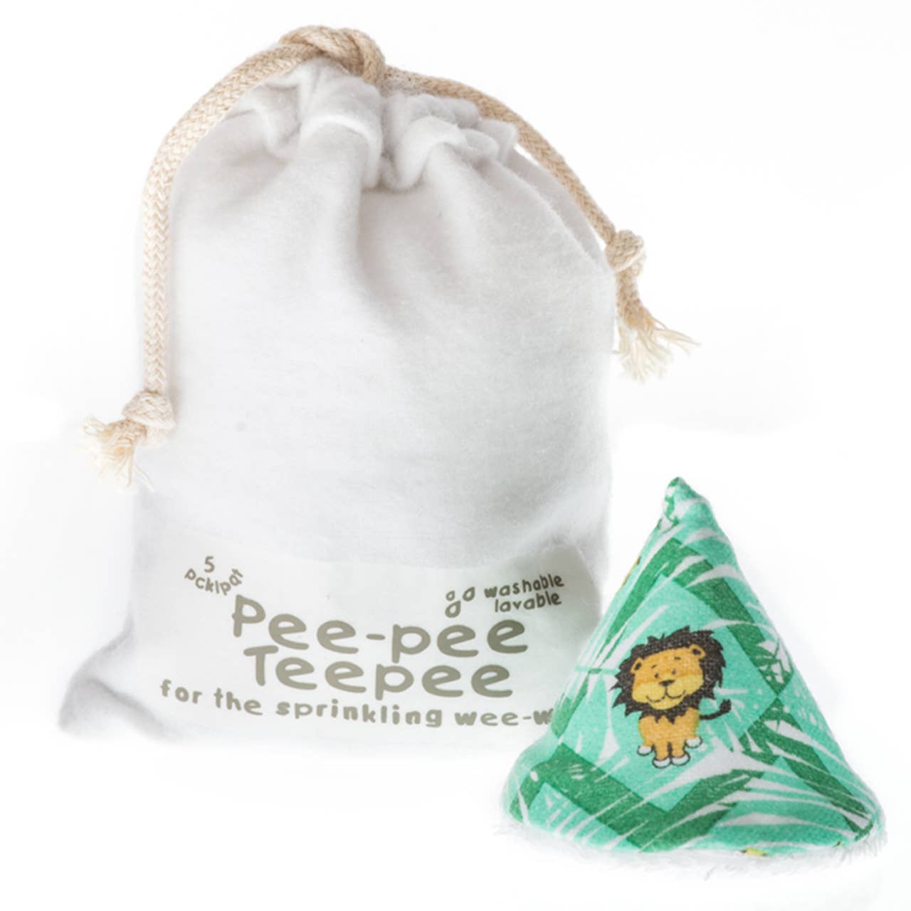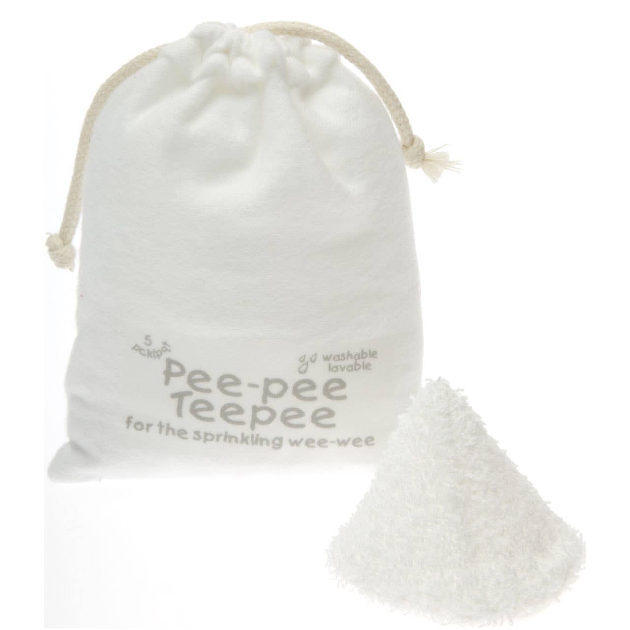 Best baby shower gift on the market! Terry lined cotton flannel for absorbency. Cone shaped to fit between thighs of baby. Washable and re-usable. With each pack of five Pee-pee Teepees, you have the choice of a flannel laundry bag or cellophane packaging.