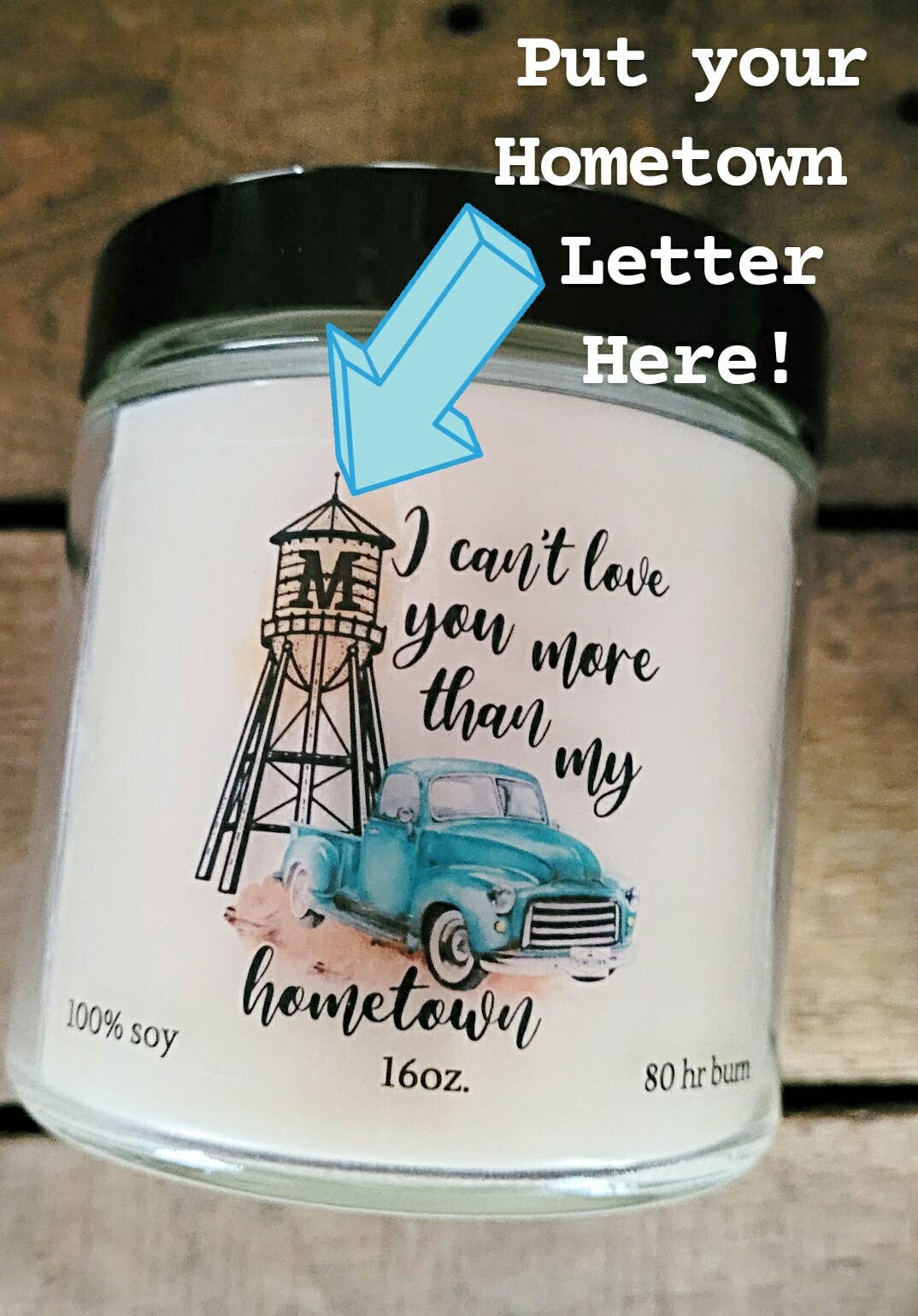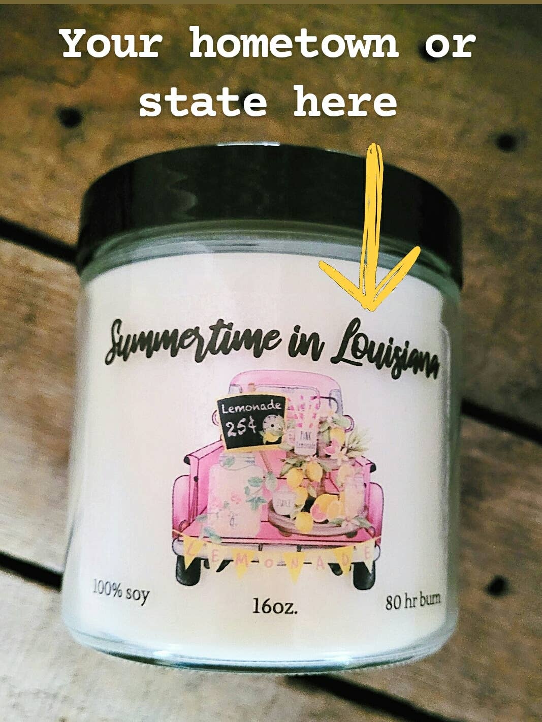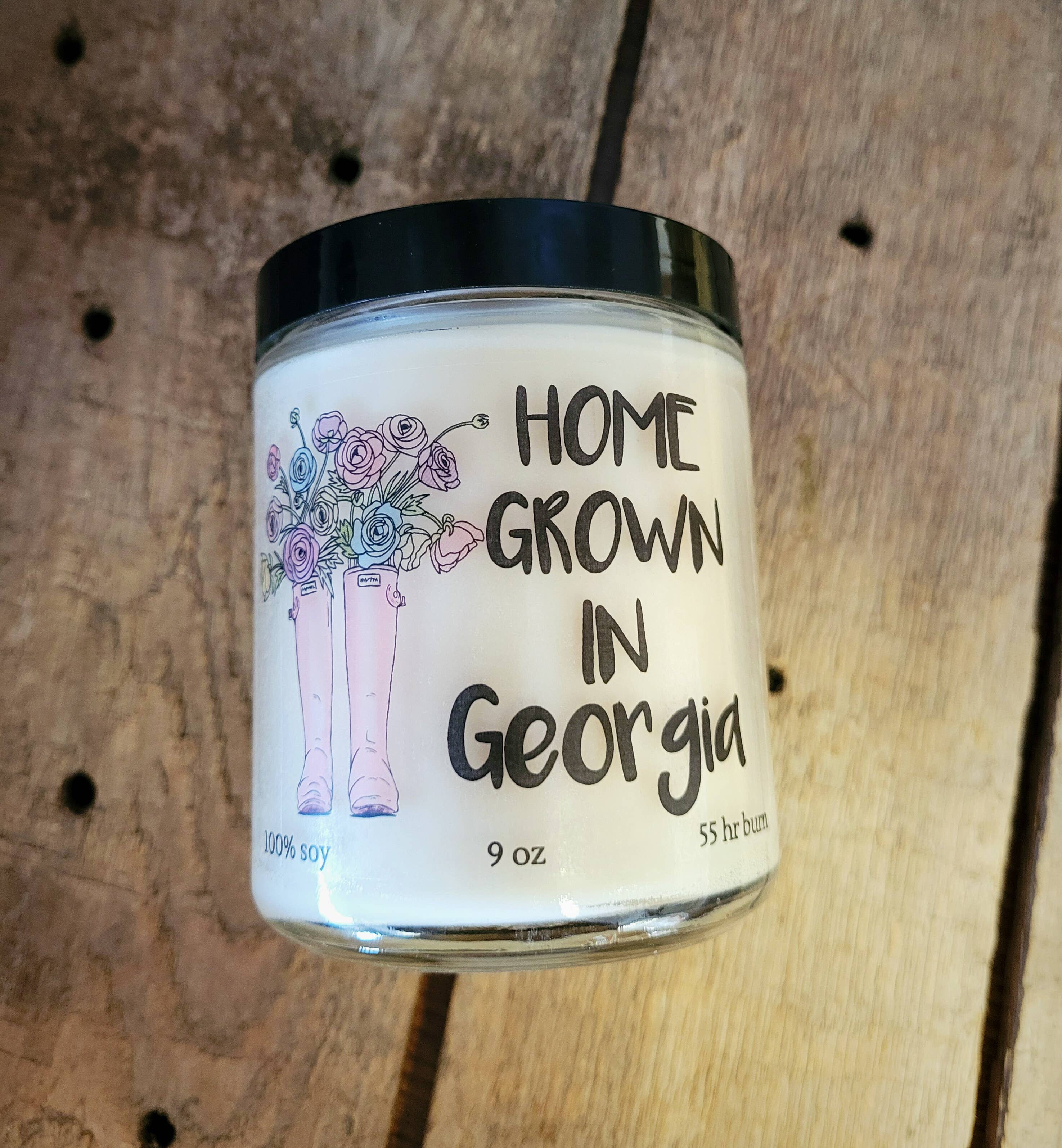 This "Home Grown" label design showcases "your hometown" name on the label. Home Grown in _________. Choose from one of our more than 40 fabulous scents! This 100% soy wax is clean burning and has an average burn time of 55+ hours for the 9 oz and 80+ hours for the 16 oz. This same label is also available in our 6-oz candle!