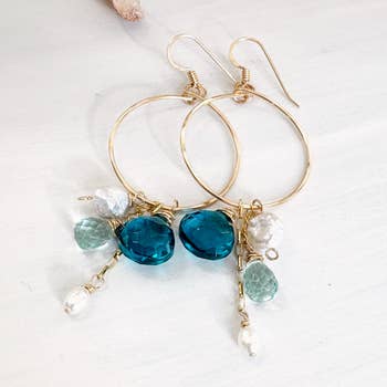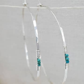 These stunning statement earrings are the perfect addition to your spring and summer wardrobe. They are hand forged from 14kt gold filled wire and hammered with a dappled texture to catch the light. They feature 3mm genuine faceted amazonite stones that are hand strung with 14kt gold filled wire around the hoop. They are very lightweight and slide easily into the ear and self hook at the back of the ear. They are 1 1/2” in diameter. Each one will be slightly unique.