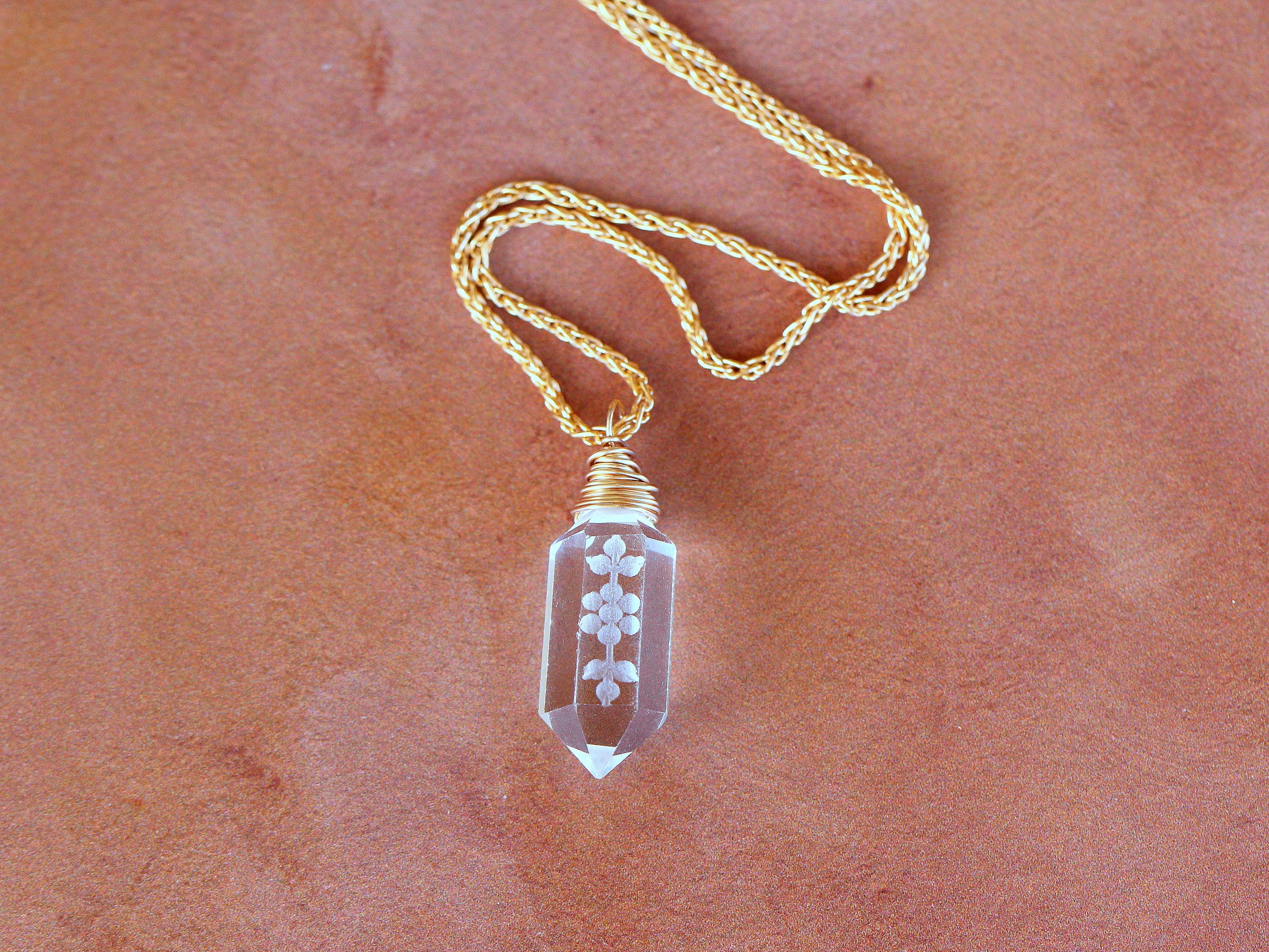 This boho chic necklace features alternating raw quartz crystals that have been arranged into a minimalist pendant. Although the design may be replicated, Mother Nature rarely duplicates itself so the size and the shape of the crystals may vary slightly from the necklace in the pictures. The necklace itself measures about 30 inches in length, while the pendant hangs down 3.5 inches. The raw brass pendant is 1.5 inches at its widest point and is secured to the nickel and lead free hardware.