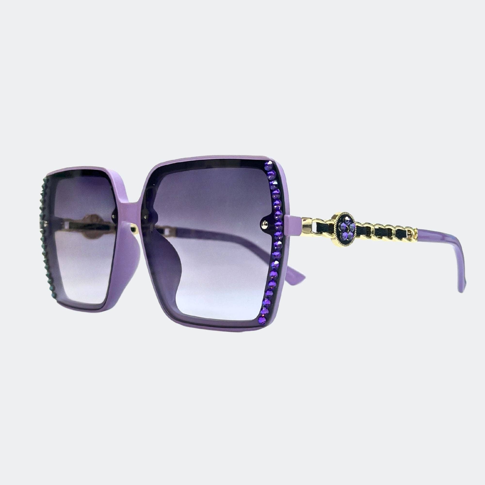 ANGELIKI- GL1780 GEOMETRY SUNGLASSES feature a modern design with a spring color, light tinted lenses embellished by hand-set crystals, and a geometric shape. The crystallized sunnies provide 100% UV protection, and come with a complimentary pouch and case for safe storage. Enjoy a stylish look without compromising safety. Glasses width: 5.4 inch