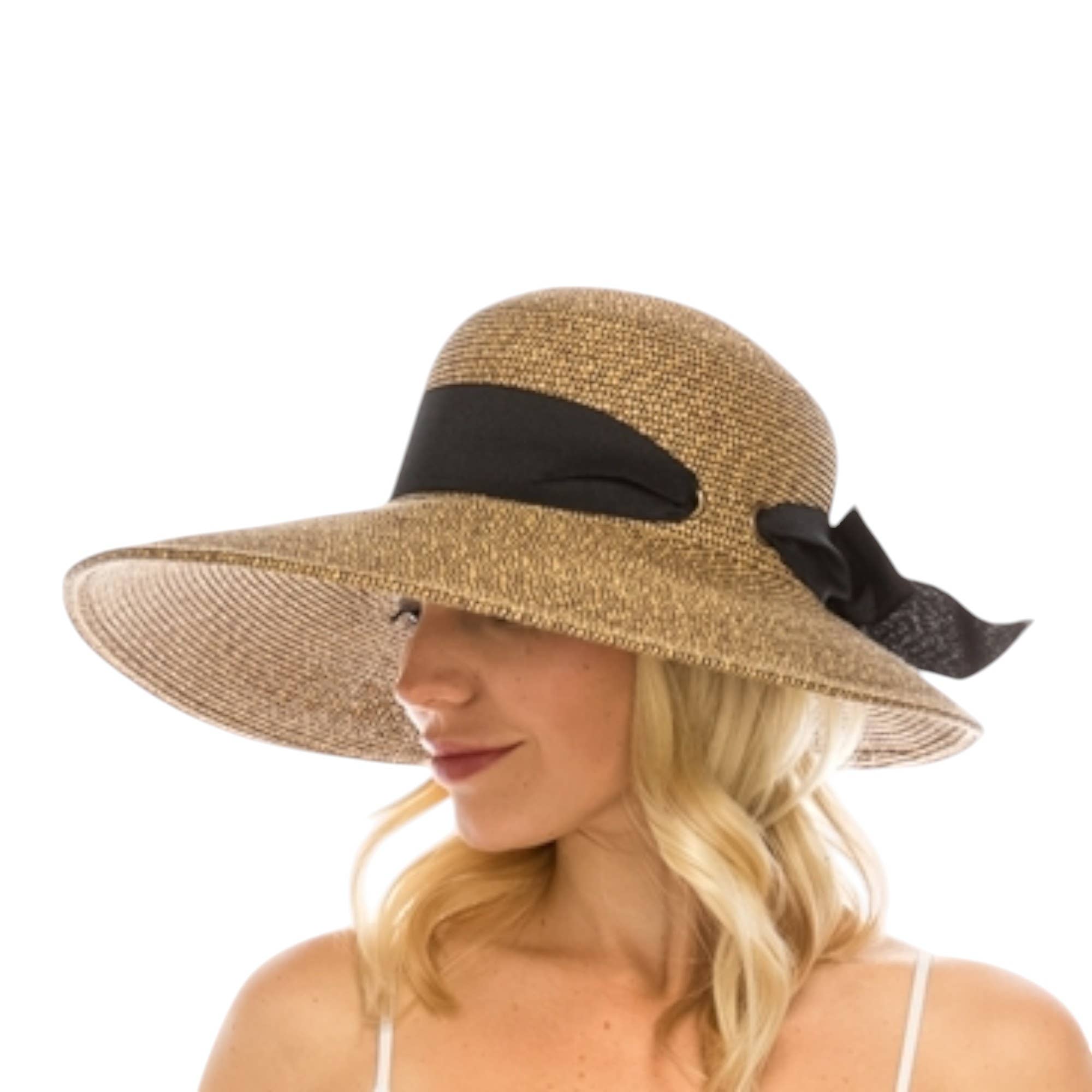 Summer sun protection in style. Asymmetrical lampshade sun hat with a grosgrain bow and eyelet detail. High quality straw provides ample shade. Great sun protection - UPF 50+. Adjustable inner drawstring Front brim: 5.5 in, Rear brim: 3.5 in. 100% Straw