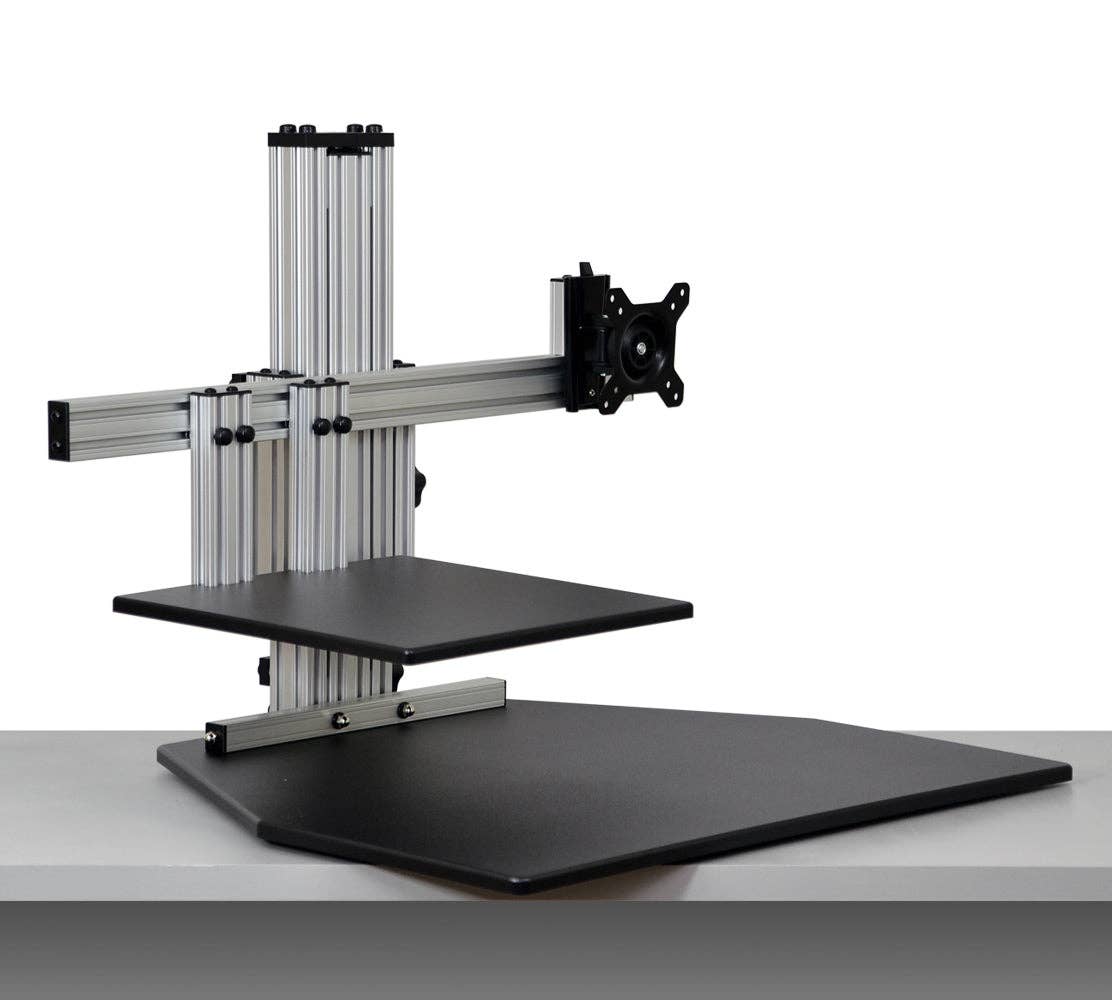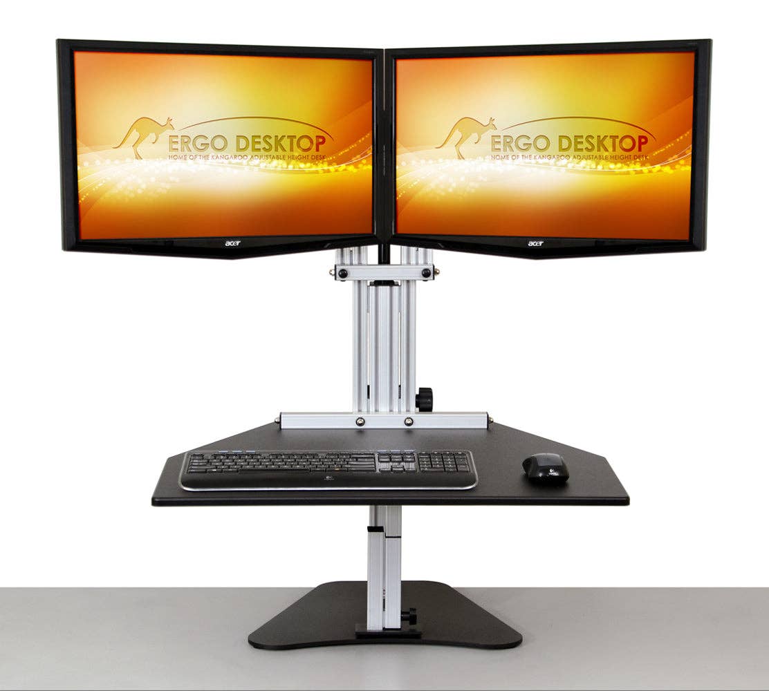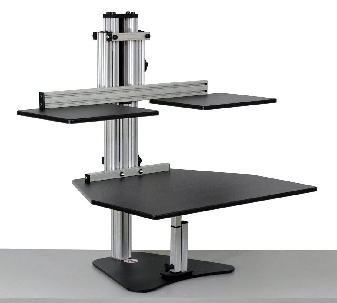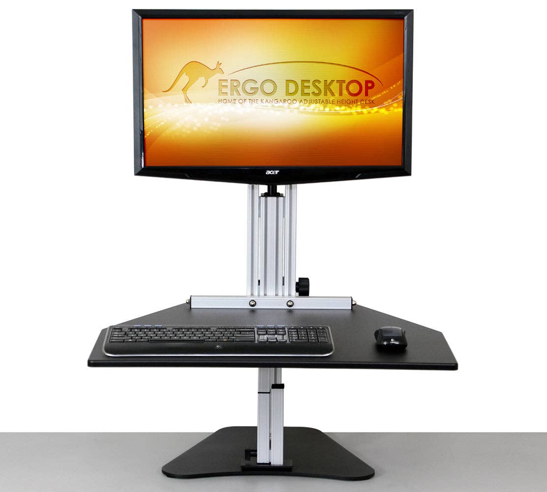 Our Kangaroo Tri-Elite Adjustable Height Desk is shown with (3) VESA mounted monitors. The mounts are fully adjustable including Pan, Tilt and Portrait to Landscape and the hinges provide 180 degree panning. The work surface that holds your keyboard and mouse is adjustable vertically 16.5" and the monitors are separately adjustable an additional 6.5" to give you maximum dual ergonomic benefit. Work surface can be set and raised to the exact height every time with the stopping bolt feature. Available in Putty, Black, Cherry, and Light Maple finish. * Able to support 3 mounted monitors side by side * Hinge design supports 180 degrees of panning * Work surface and monitor adjust separately giving you Dual Ergonomics * Work surface of our adjustable height desktop can be raised to the exact same location by using our "stopping bolt" feature * Main work surface measures 28" wide by 24" deep * Main work surface is adjustable 16.