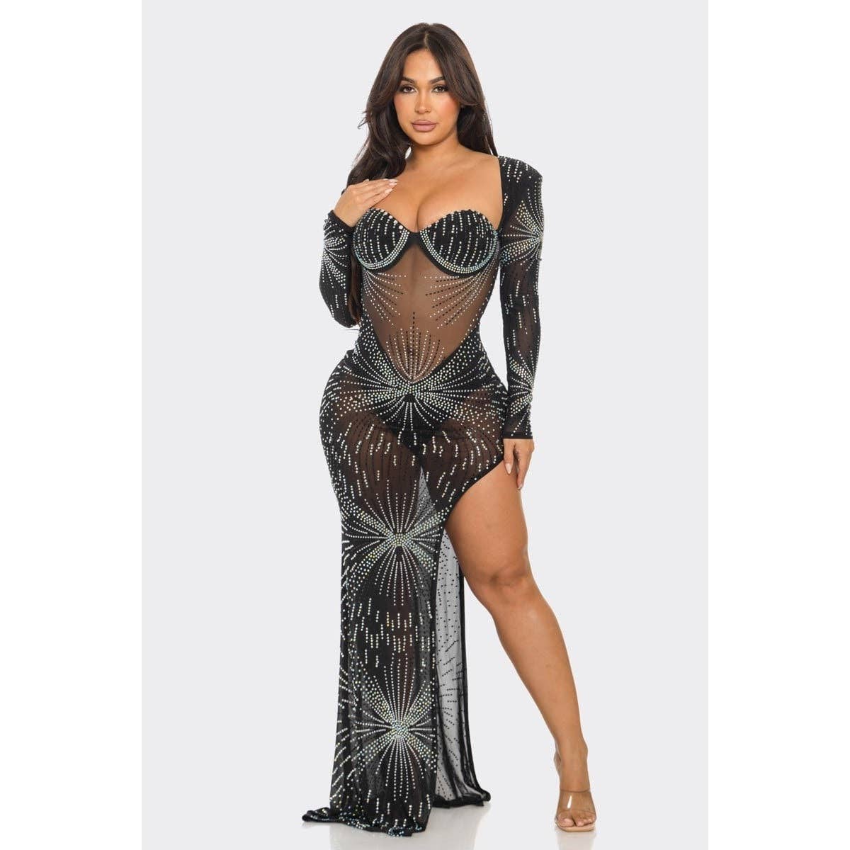 Western Fashion presents the 7194 Rhinestone Mesh Dress, a perfect blend of classic aesthetic and modern design. This long-sleeved dress features a sophisticated mock neck and is adorned with sparkling rhinestones, adding a touch of glamour to your night out. As a family business since 1985, we are committed to providing high-quality fashion pieces that elevate your style. This dress is not just a garment, it's a statement of elegance and sophistication. Step out in confidence with Western Fashion.