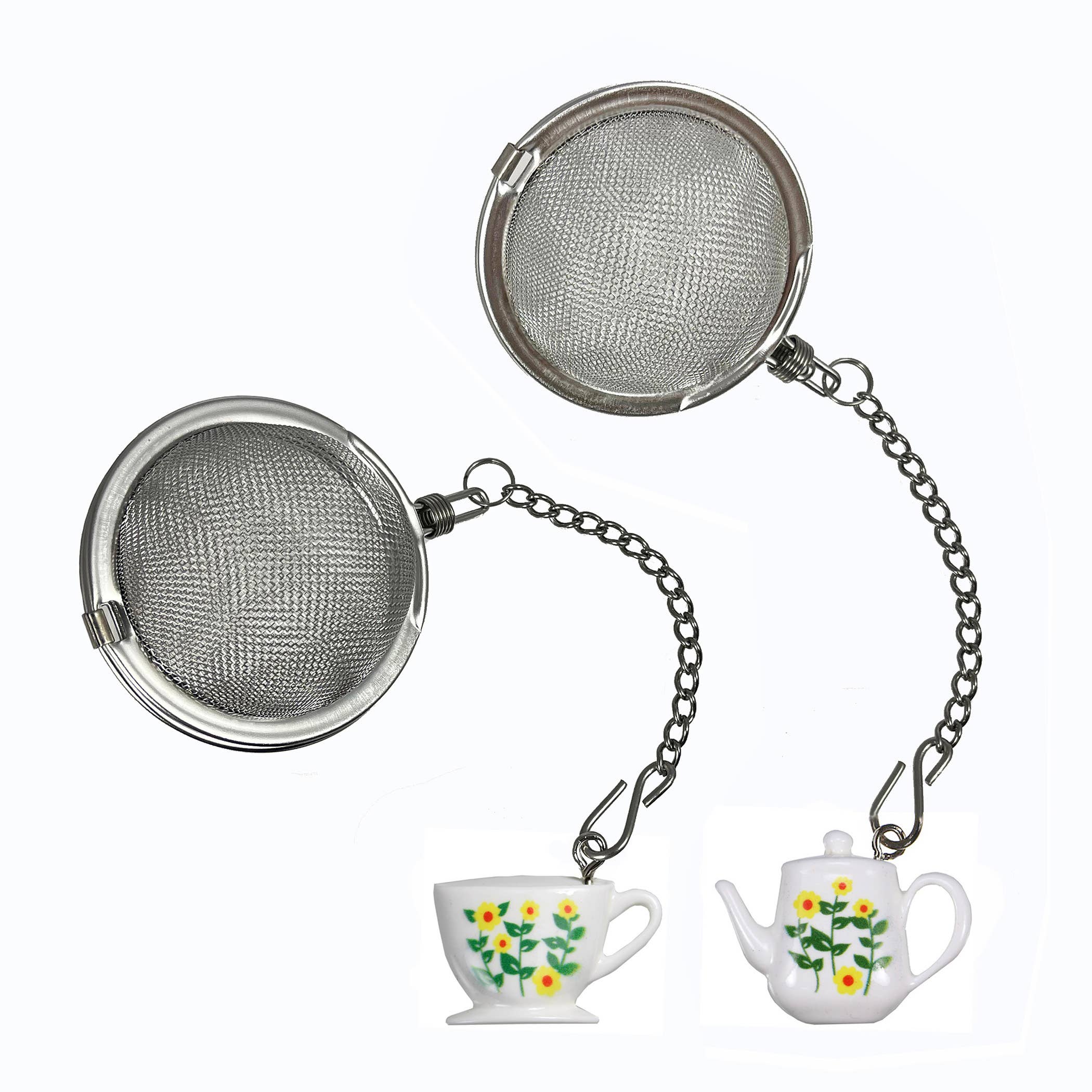 Enjoy a fresh cup of brewed loose tea with these adorable tea ball infusers. Quality stainless steel infuser with decretive pink and blue flower charms. case of 12 set of 6 pink and 6 blue individually packaged