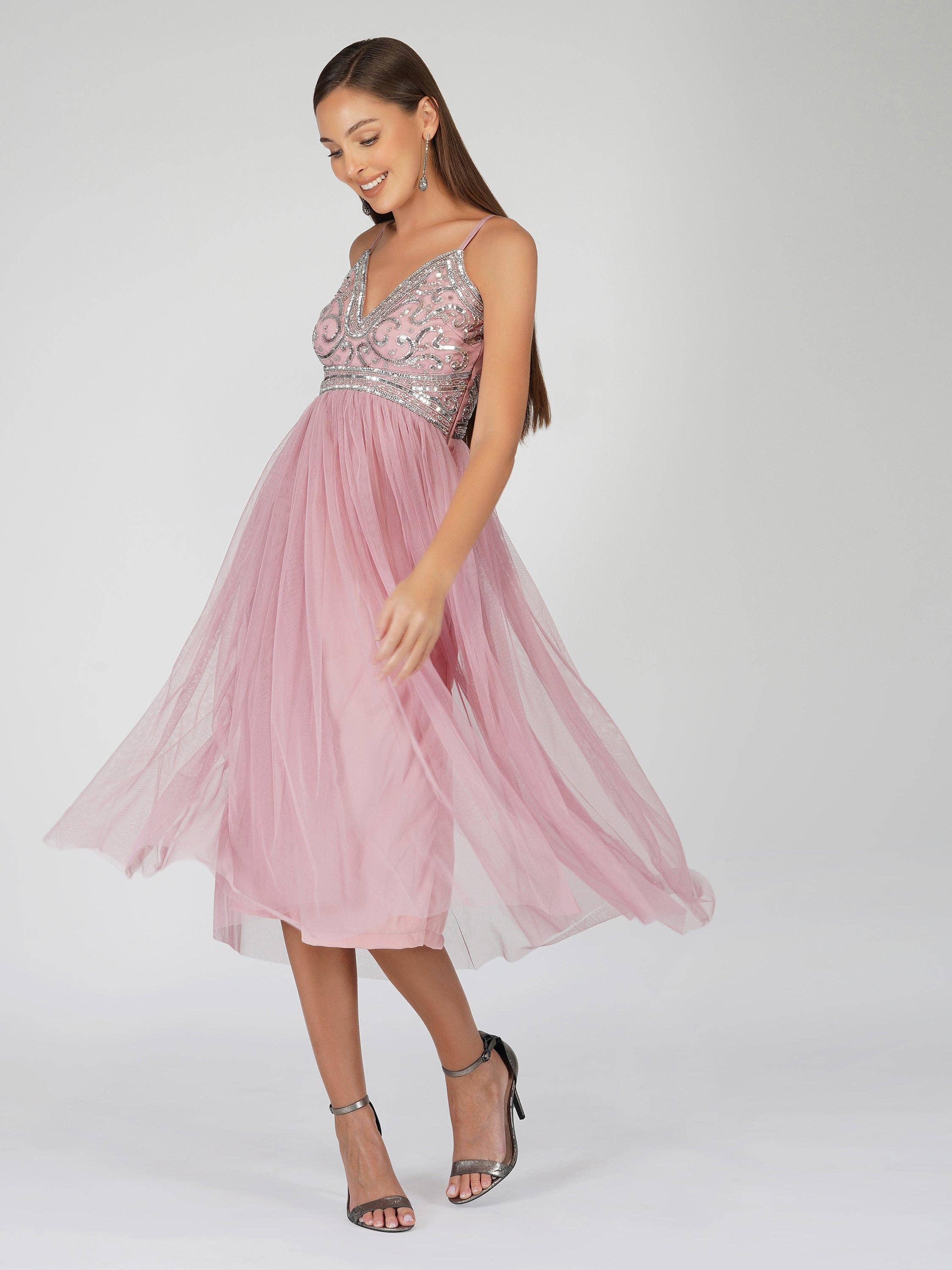 Lace & Beads Aurelia Pom Pom Mini Dress. This big ruffle hem dress is here to take your style game up a notch! Say goodbye to ordinary and hello to extraordinary with this one-shoulder pink mini dress. Get ready to make a statement in this tulle mini dress that's not just about the dress– it's a vibe. But wait, there's more! - The cut-out detailing and those pom poms swaying at the bottom make this a one-of-a-kind dress. And let's talk about that sage color – it's the cool and collected shade you've been searching for. Whether it's a high-energy party or a sophisticated event, this dress adds the perfect touch of elegance. The Aurelia Dress is your passport to an unforgettable night out. Let's light up those nights and set the trends with the Aurelia Dress – the ultimate pink party dress! Model is wearing: UK 8/ EU 36/ US 4