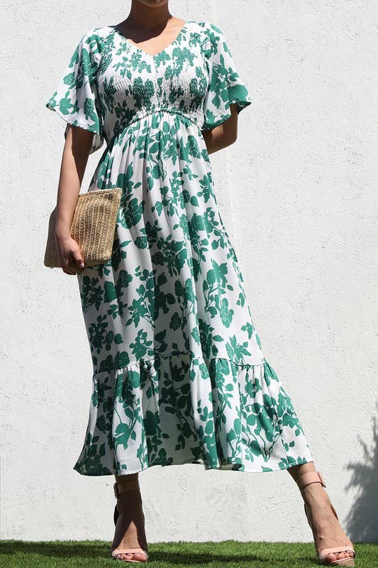 Green Floral Print Bubble Sleeve Smocked Tiered Midi Dress