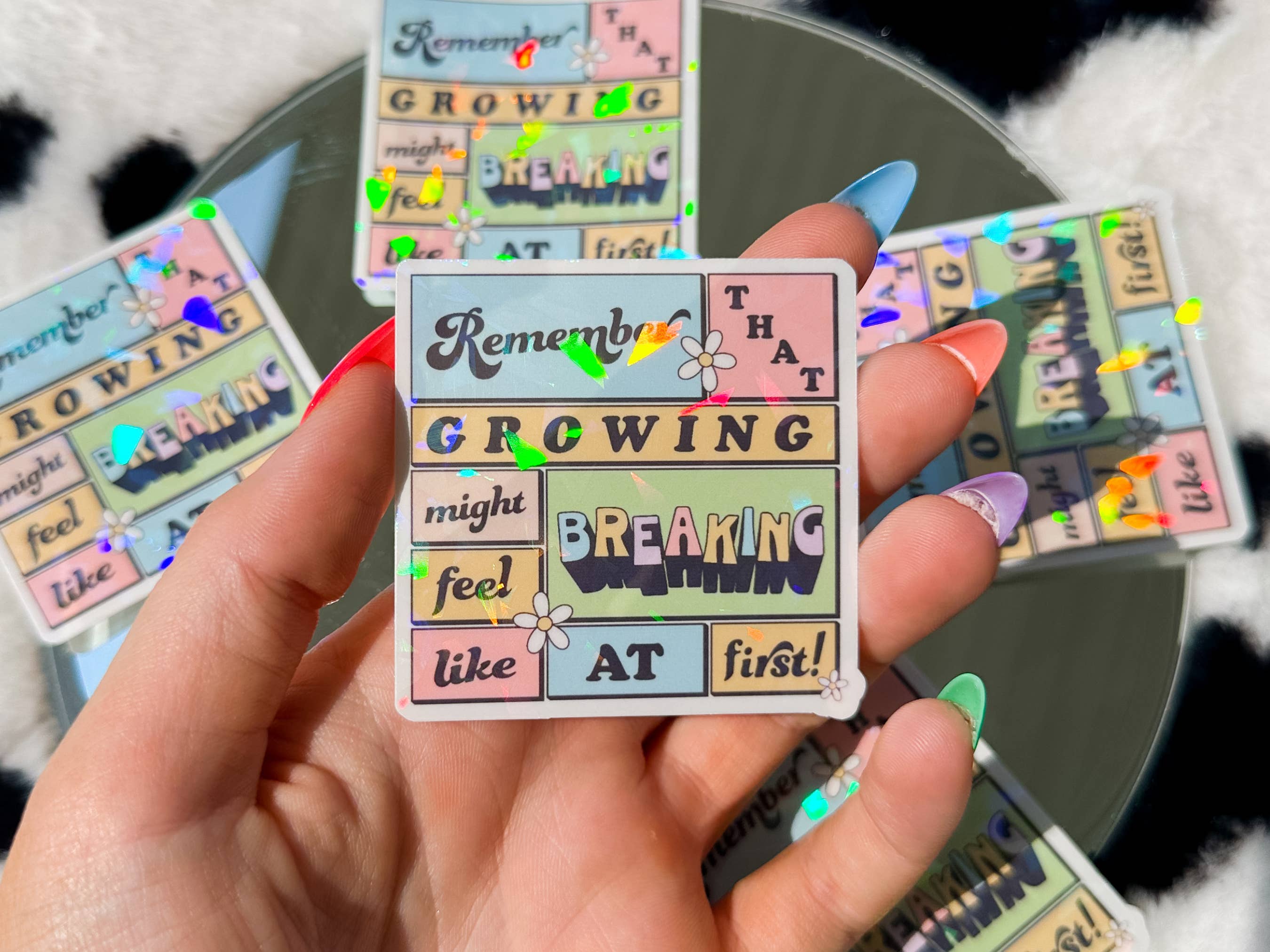 Multiple angles to show the holo effect, this is the same design as my other sticker featuring lyrics from Taylor Swift’s I Can Do it With a Broken Heart but now with a holographic effect. This is a lyric from the album Tortured Poets Department and is great for water bottles, laptops, iPads, phones, cars, etc. Great for gifts!