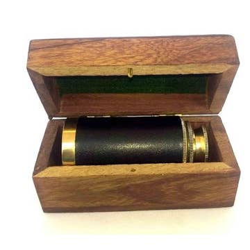 This brass telescope features a long, cylindrical shape with a glossy, golden-brown finish. The brass construction not only offers a timeless, refined look but also provides durability and strength. This telescope has a retractable or extendable design, allowing for adjustable focus, and ease of portability. Also comes with a beautiful leather covered Antique Box. Size: 7x3x3 Materila: Brass