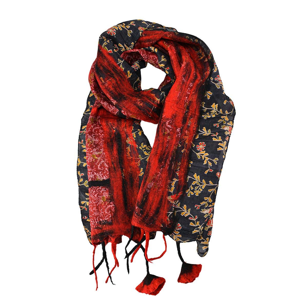 Dimensions: Length 76 Inches x Width 15 Inches ( Including Flower) Flower Diameter: 4 Inches Material: 100% Marino Wool with Silk Sari Handcrafted in Nepal Felt fibers intricately patched on a vintage Silk Sari (Traditional Clothing) form the foundation of our stunning scarves. Crafted from 100% Merino wool and handmade, each piece is exceptionally soft and warm. The unique combination of colors and textures ensures that every scarf is distinct, making each creation one-of-a-kind. Embrace the warmth and individuality in our beautifully crafted scarves. Care Instruction: Wash in cold water, reshape gently, and air dry or Spot clean with a damp cloth if necessary, using mild detergent with lukewarm water Disclaimer: Please understand that all of our products are handcrafted, and while our artisans work hard to produce only the best, each piece is distinctive, alluring, and full of amazing detail