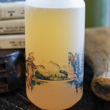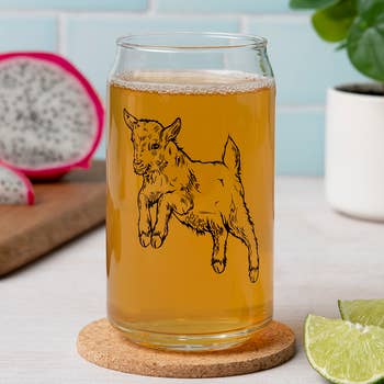 Beer Glass - Cow Cuts A 16 ounce thick bottomed pint mixing glass with neoprene insulated leather sleeve. Our leather beer sleeves wrap around the glass and snap together with 3 vertical snaps. Stamped with one of our stock designs or a custom design.