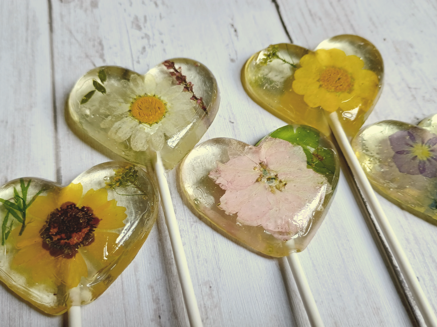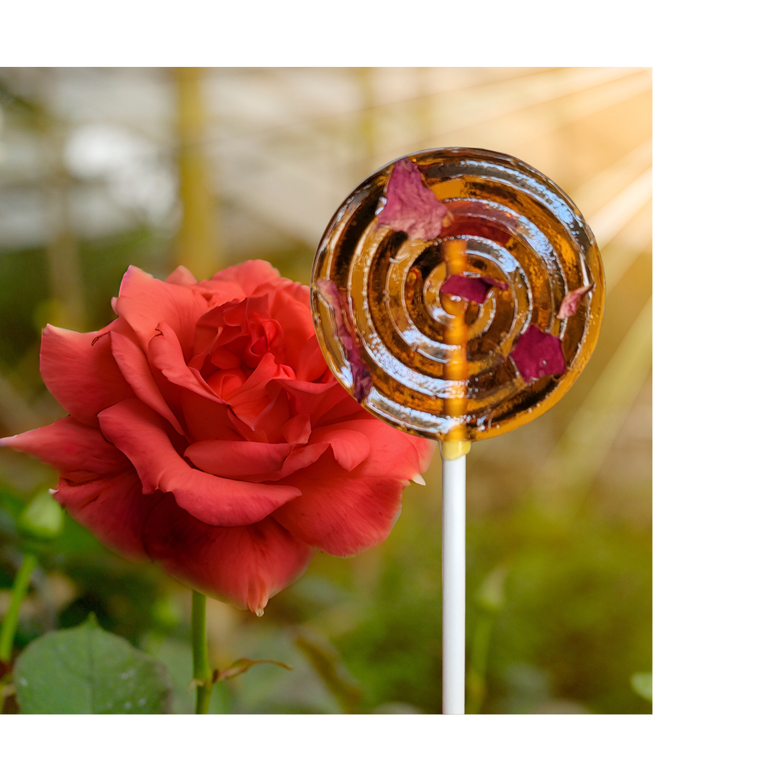 Gorgeous hand-cut, 100% edible flowers surrounded in our delicious signature hard candy! Our handcrafted gold flakes and gold edible glitter make an appearance in this beautiful floral collection! ALL OUR DESIGNS ARE VEGAN, GLUTEN FREE, DAIRY FREE AND NUT FREE and are labeled with ingredient & allergen information. *Please review our turnaround on shop banner, this varies depending on time of year. Our product is handcrafted and always in high demand. Rush fee options available, please reach out with any questions! Dimensions: 2 1/4” in diameter Flavor: Melon Size: 1.3 oz (36g). Branded Stick: 6" long, 5 /32" thick SHELF LIFE: WE DO NOT GIVE SET SHELF LIFE. AS LONG AS CANDIES ARE STORED/KEPT UNDER 35% *HUMIDITY* THEY MAY LAST UP TO ONE YEAR. HIGH HUMIDITY AREAS ARE RECOMMENDED TO USE A DEHUMIDIFIER TO REMOVE EXCESS HUMIDITY FROM CLOUDING CANDY. WE ARE NOT LIABLE FOR CONDITION OF PRODUCT ONCE IT LEAVES OUR TEMP/HUMIDITY CONTROLLED FACILITY.