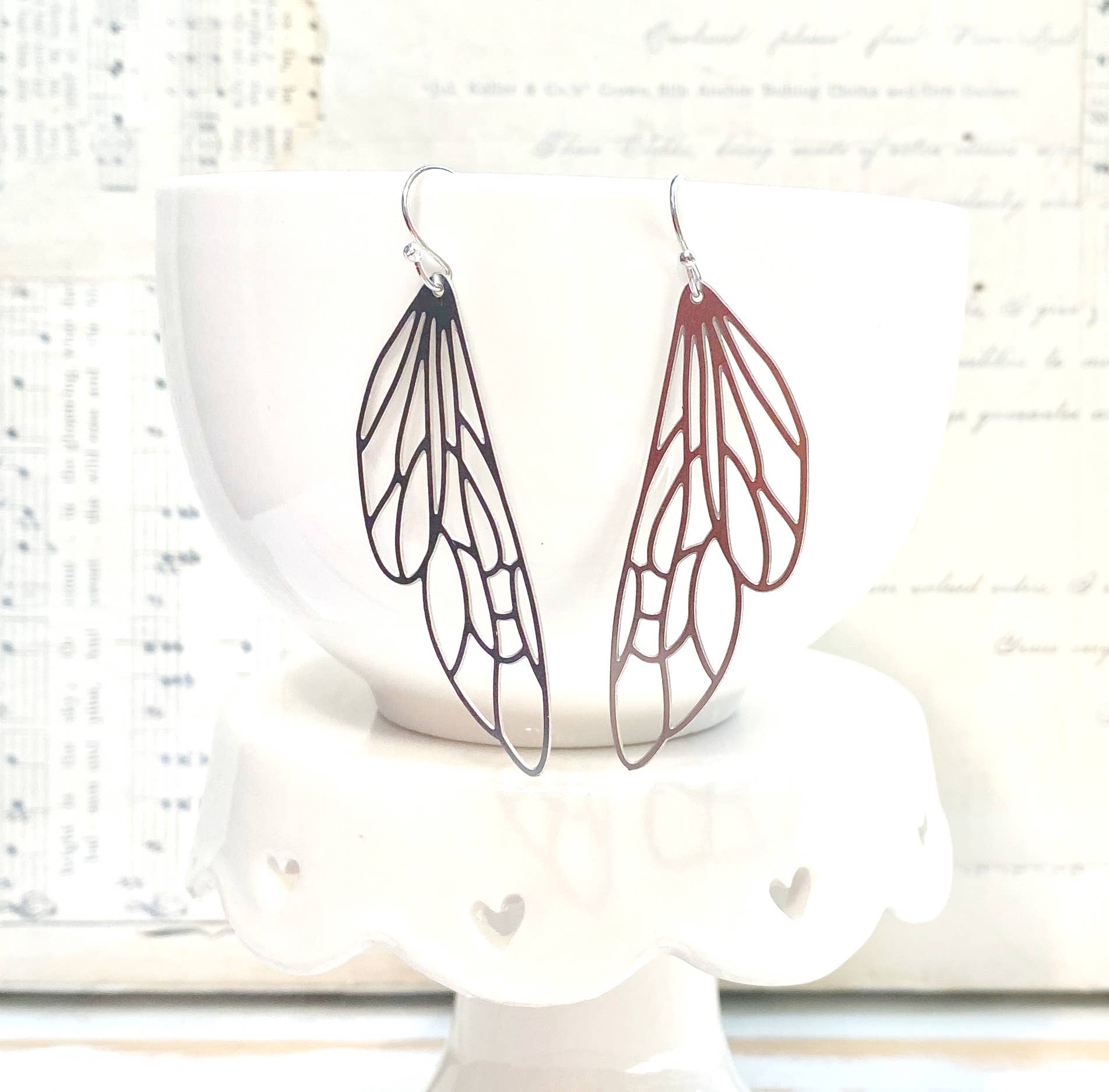 These are such lovely lace style fairy wing earrings. They are beautiful enough for a special occasion or a fun statement for everyday. Each matte silver wing earring measures approx. 2 1/4 inches. These lightweight silver wings hang from silver plate ear wires. Fun earrings to commemorate this summer's rare cicadapocalypse!